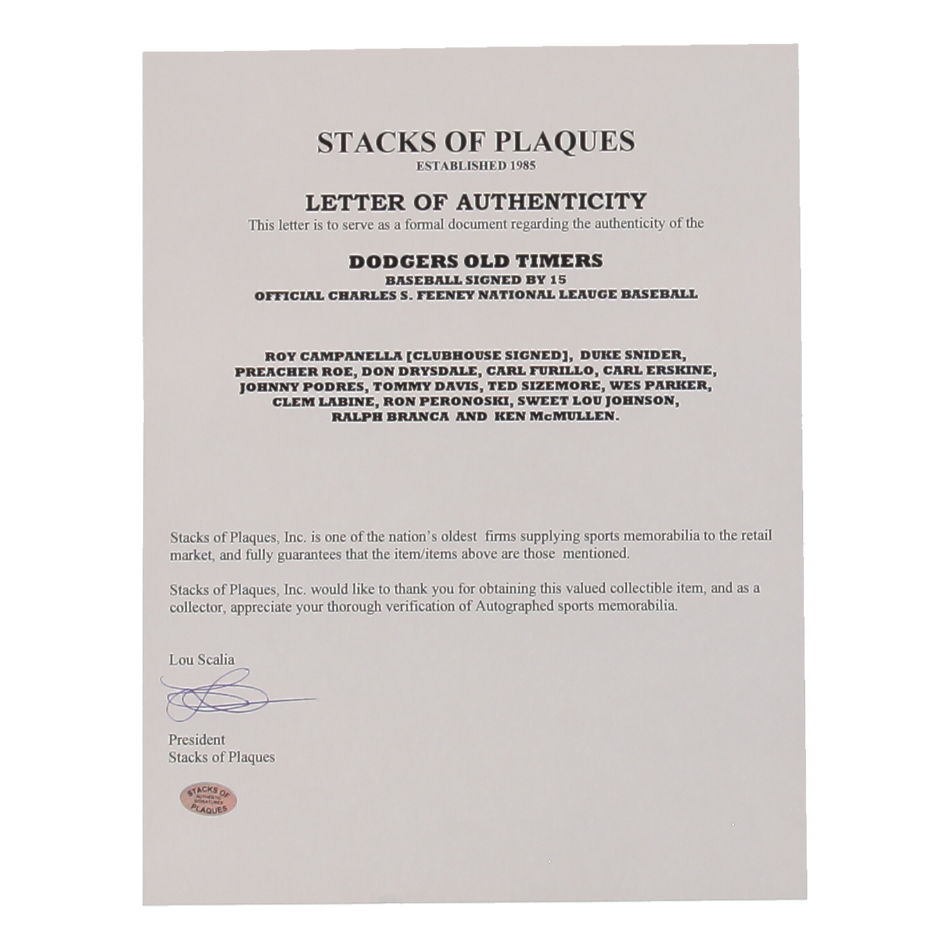 Dodgers Old Timers ONL Baseball Signed by (15) with Duke Snider, Preacher Roe, Don Drysdale, Carl Furillo (Stacks of Plaques)