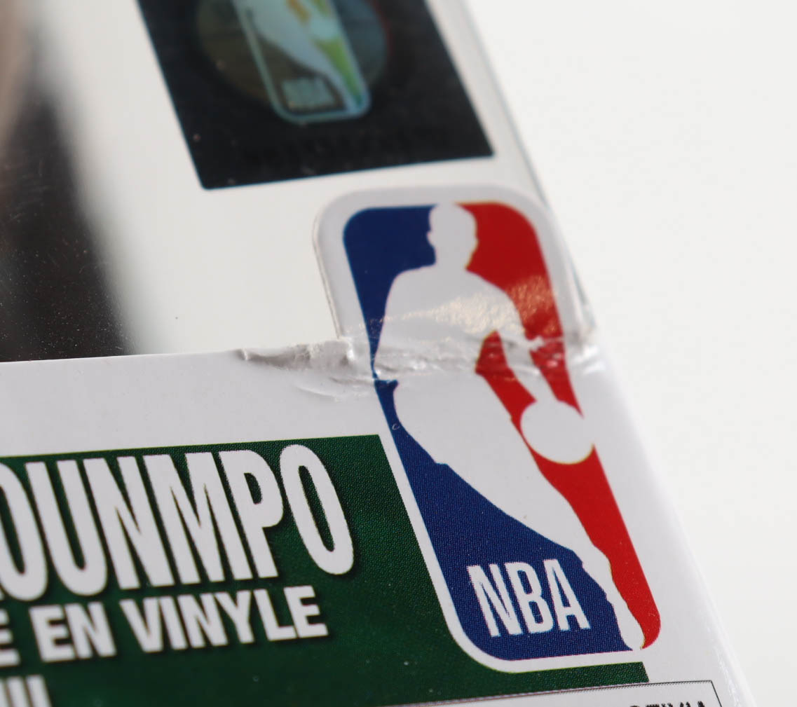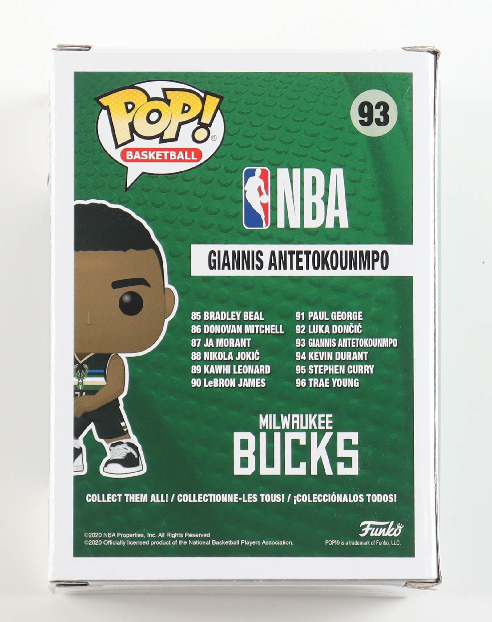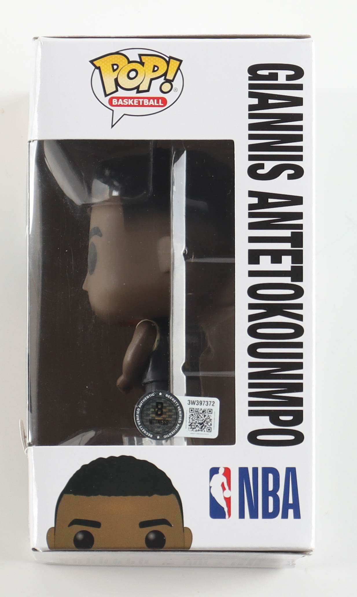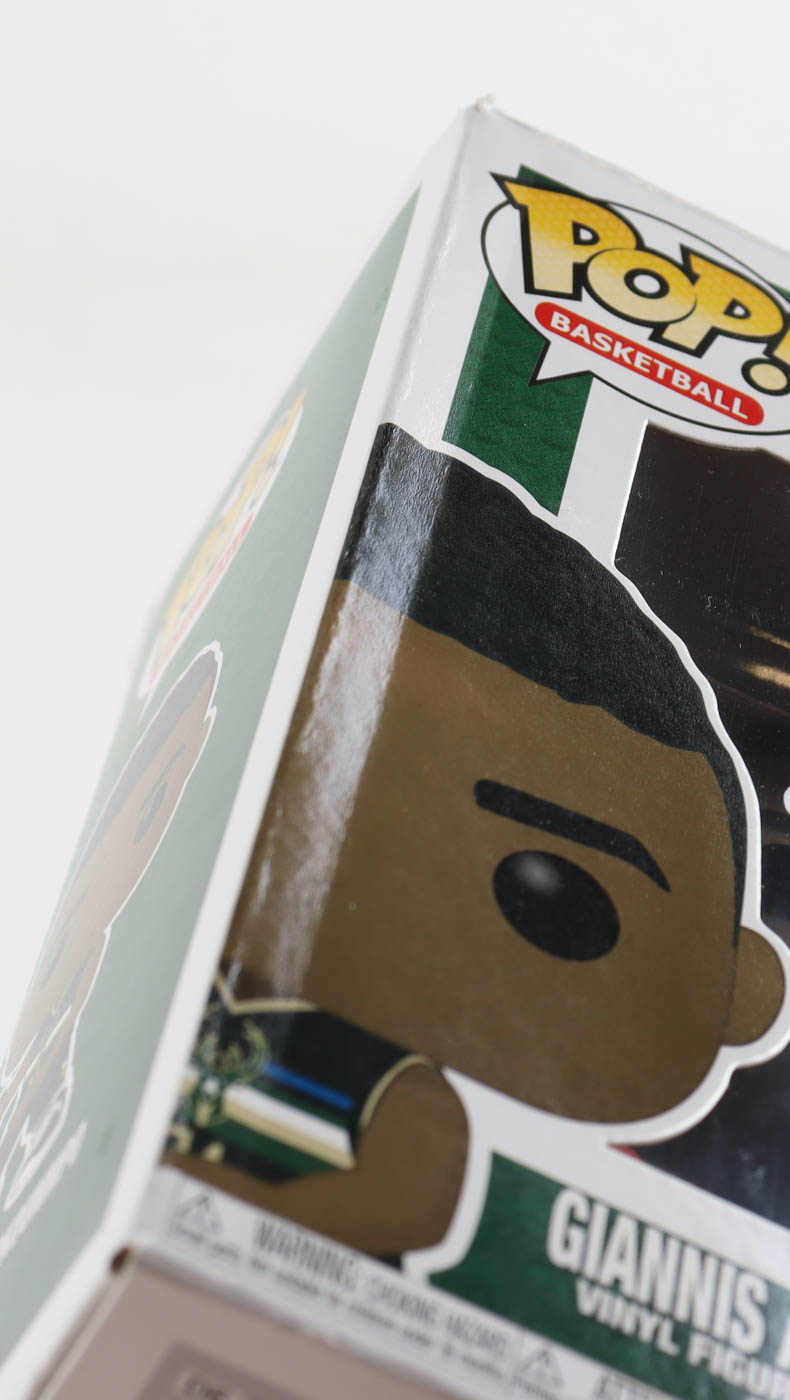 Funko Pop! vinyl figure that measures approximately 4" tall in size and has been hand-signed by Giannis Antetokounmpo (Milwaukee Bucks). Please note that the original packaging shows signs of damage.