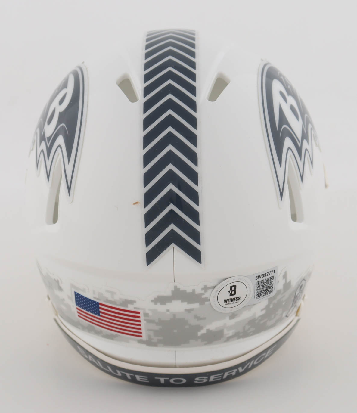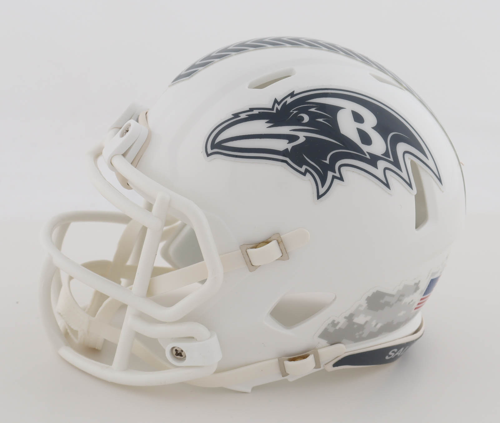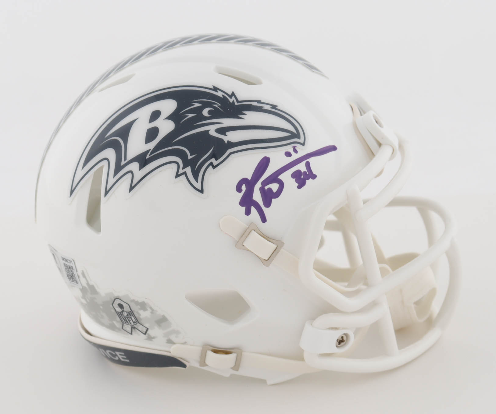 Riddell Baltimore Ravens Salute To Service Alternate Speed mini helmet has been hand-signed by Ricky Williams.