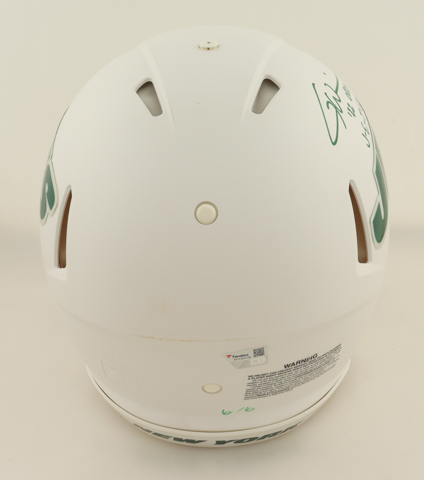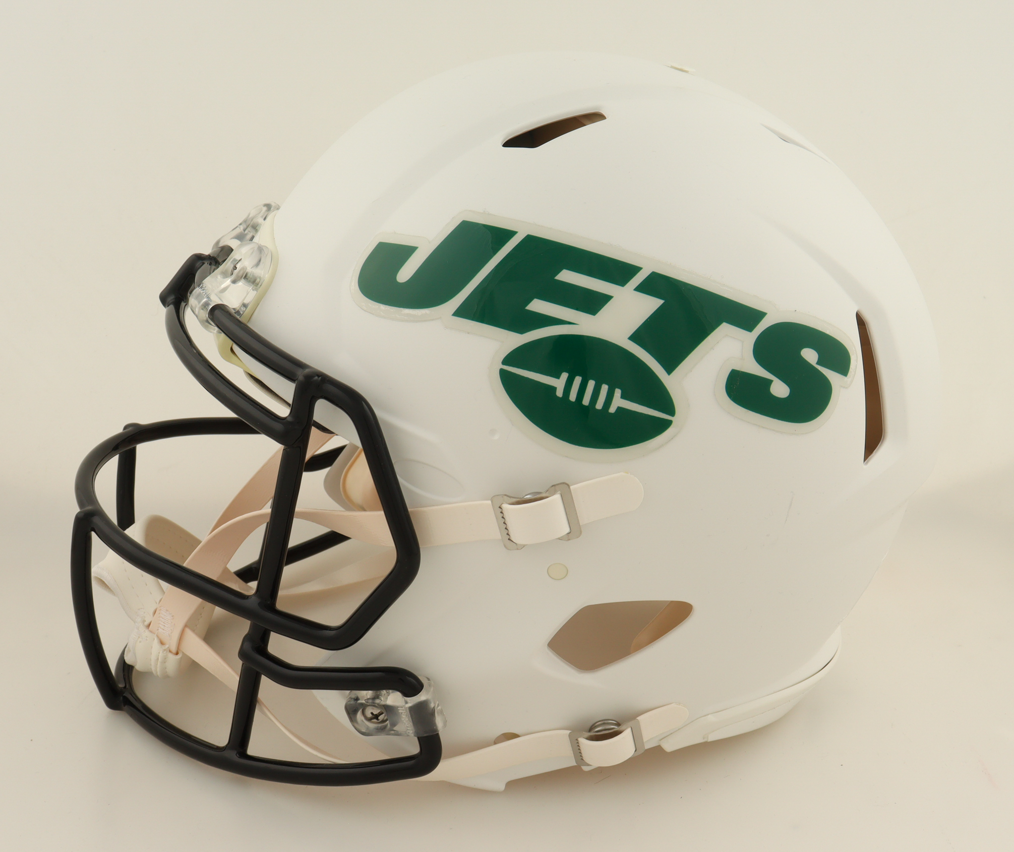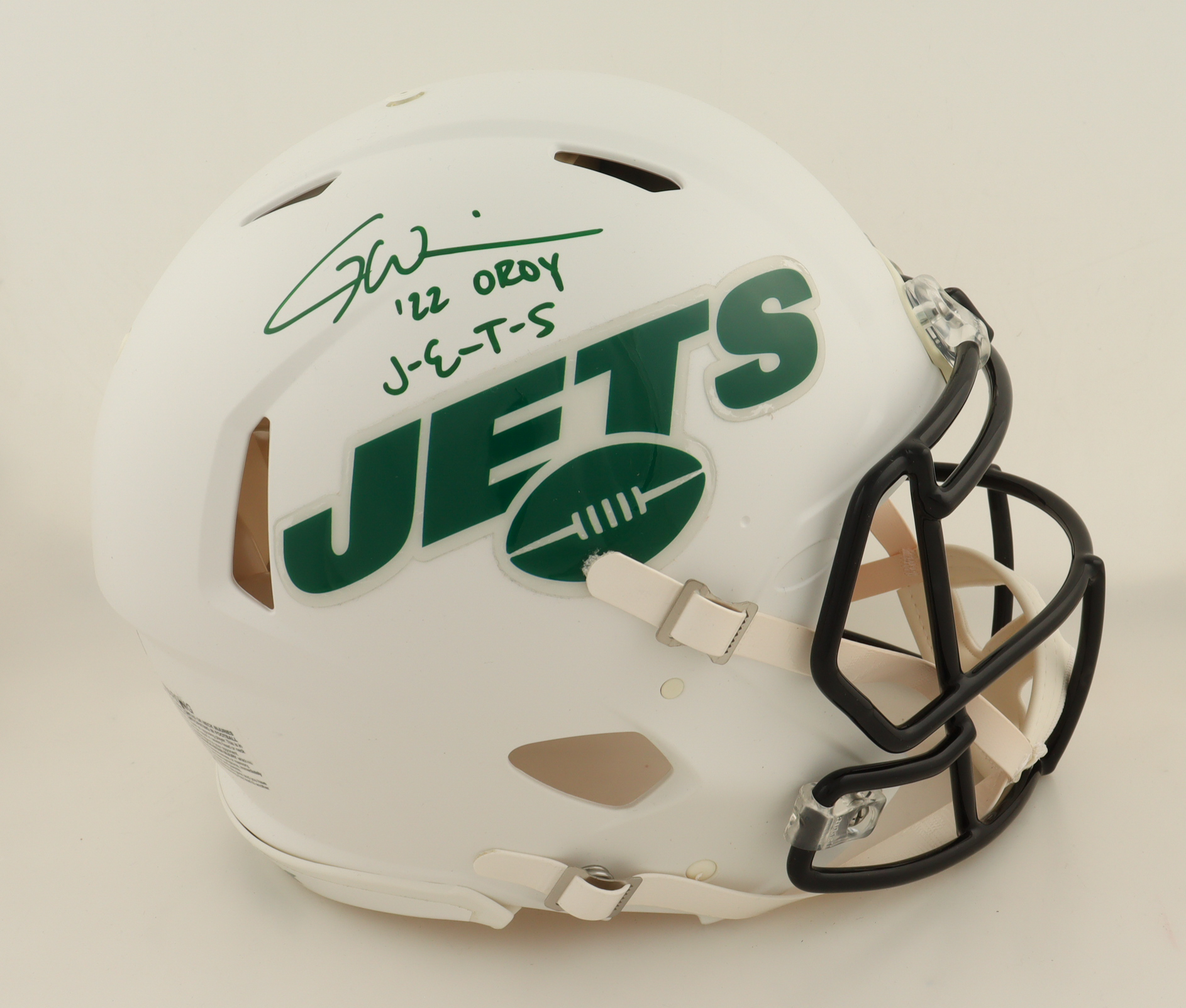 Riddell New York Jets full-size authentic on-field Lunar Eclipse Alternate Speed helmet. Hand-signed and inscribed by Garrett Wilson. Please note, there is scuffing on the helmet.