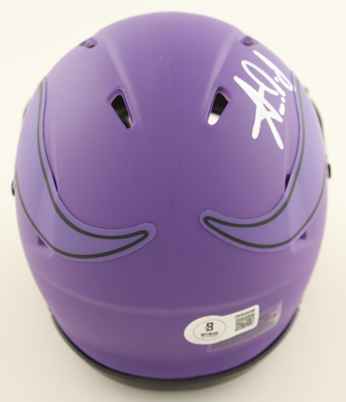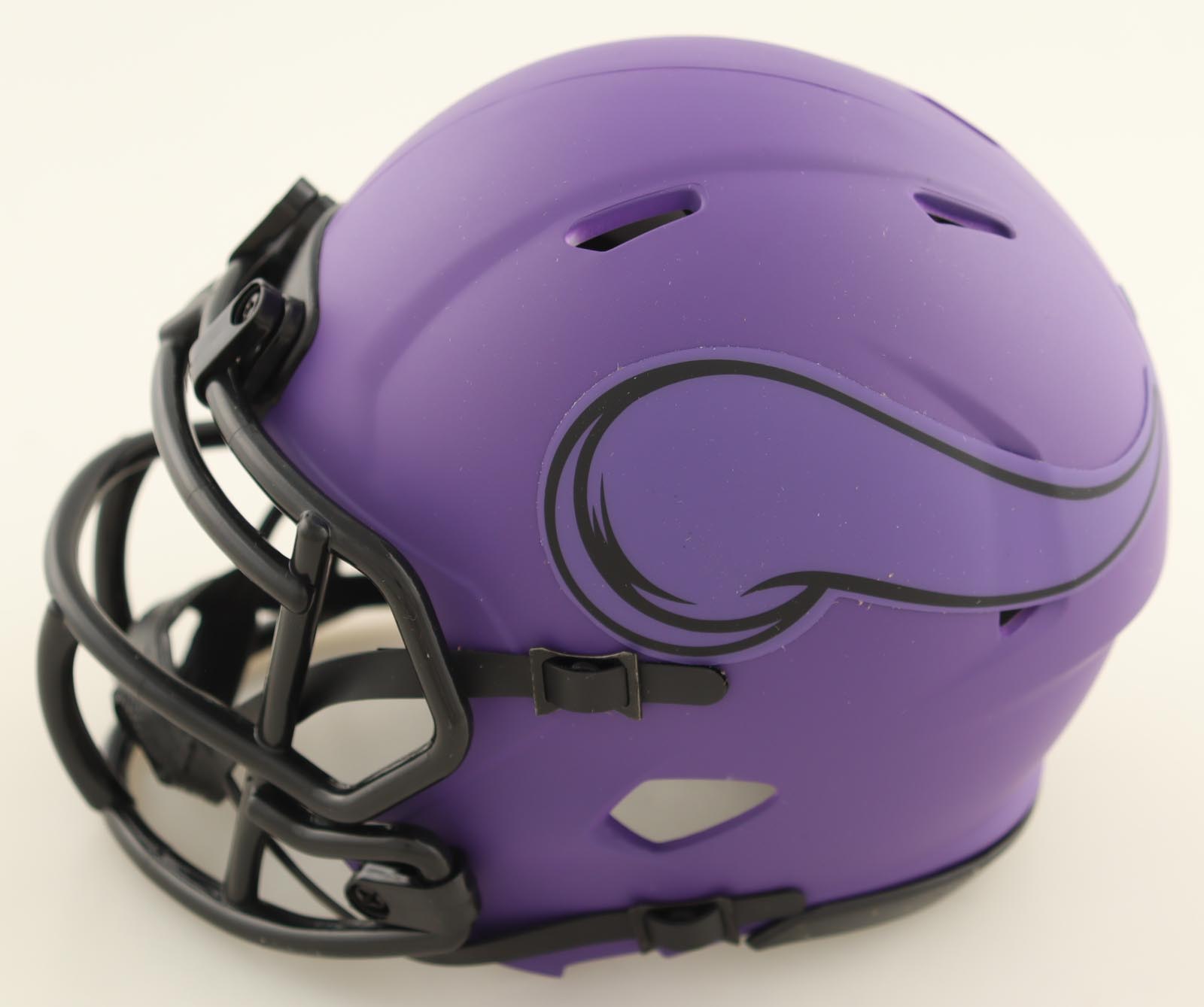 Riddell Minnesota Vikings Rave Alternate speed mini helmet. Hand-signed by Aaron Jones. Please note, logo has been scuffed. See photos for more details.