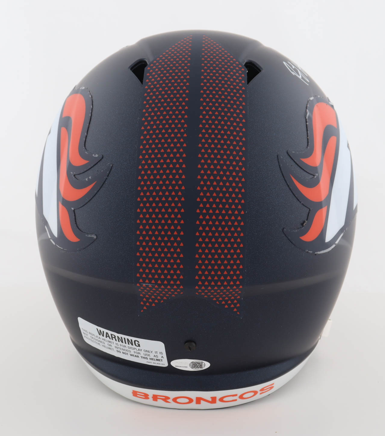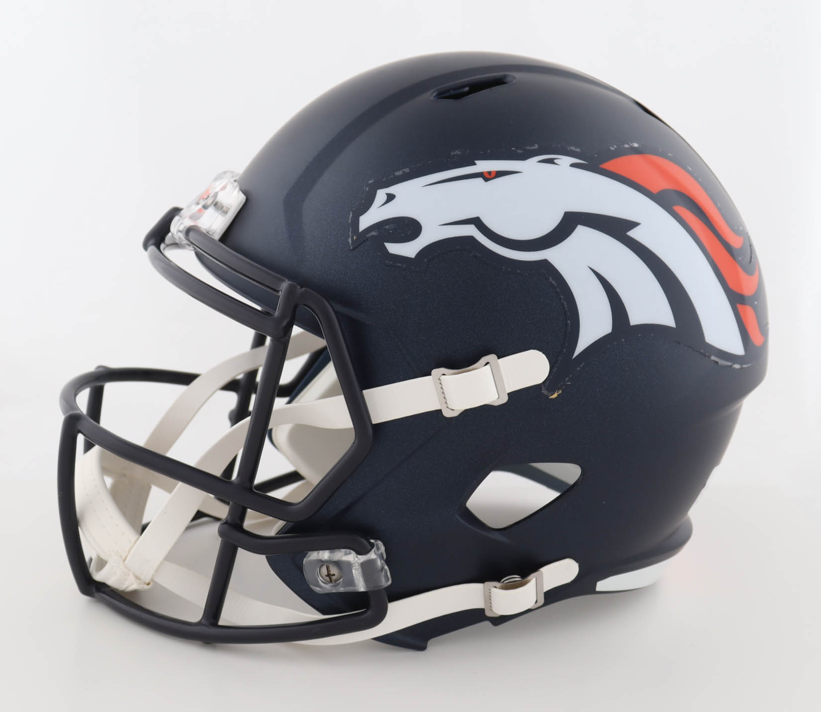 Riddell Denver Broncos full-size speed replica helmet has been hand-signed and inscribed by RJ Harvey.