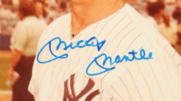 Custom framed display measures approximately 19" x 22" and has been hand-signed by Mickey Mantle (D. 1995, New York Yankees, HOF). Please note, frame borders have significant damage. Please see photos for more details.