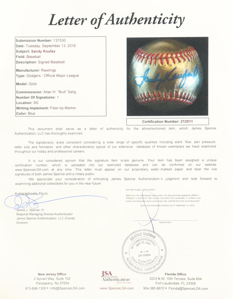 Rawlings Dodgers Official Major League Gold Leather baseball. Hand-signed by Sandy Koufax (Brooklyn / Los Angeles Dodgers, HOF).