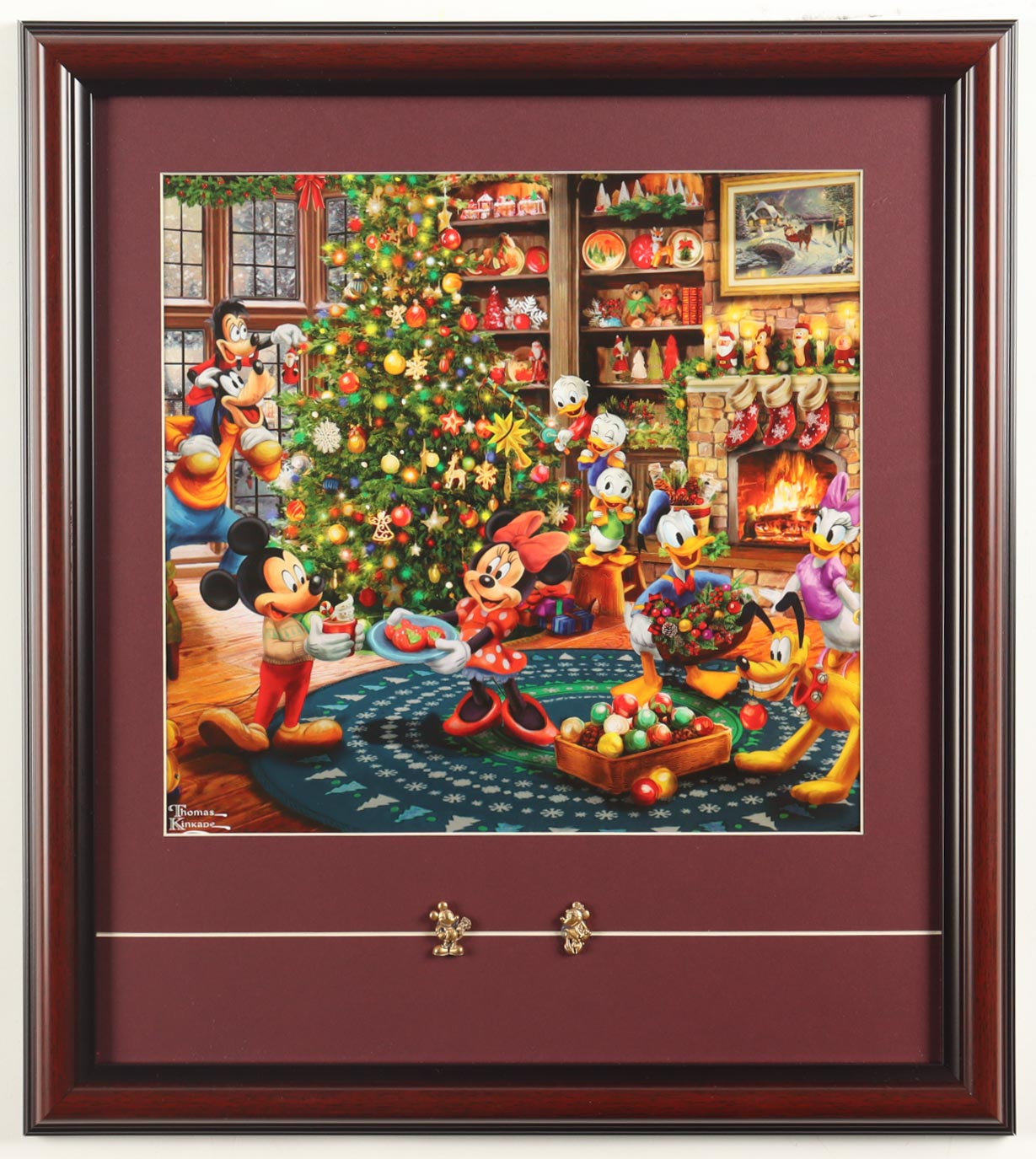 Thomas Kinkade "Mickey & Friends Christmas" Custom Framed Print Display with (2) Retired Mickey & Minnie Brass Pins