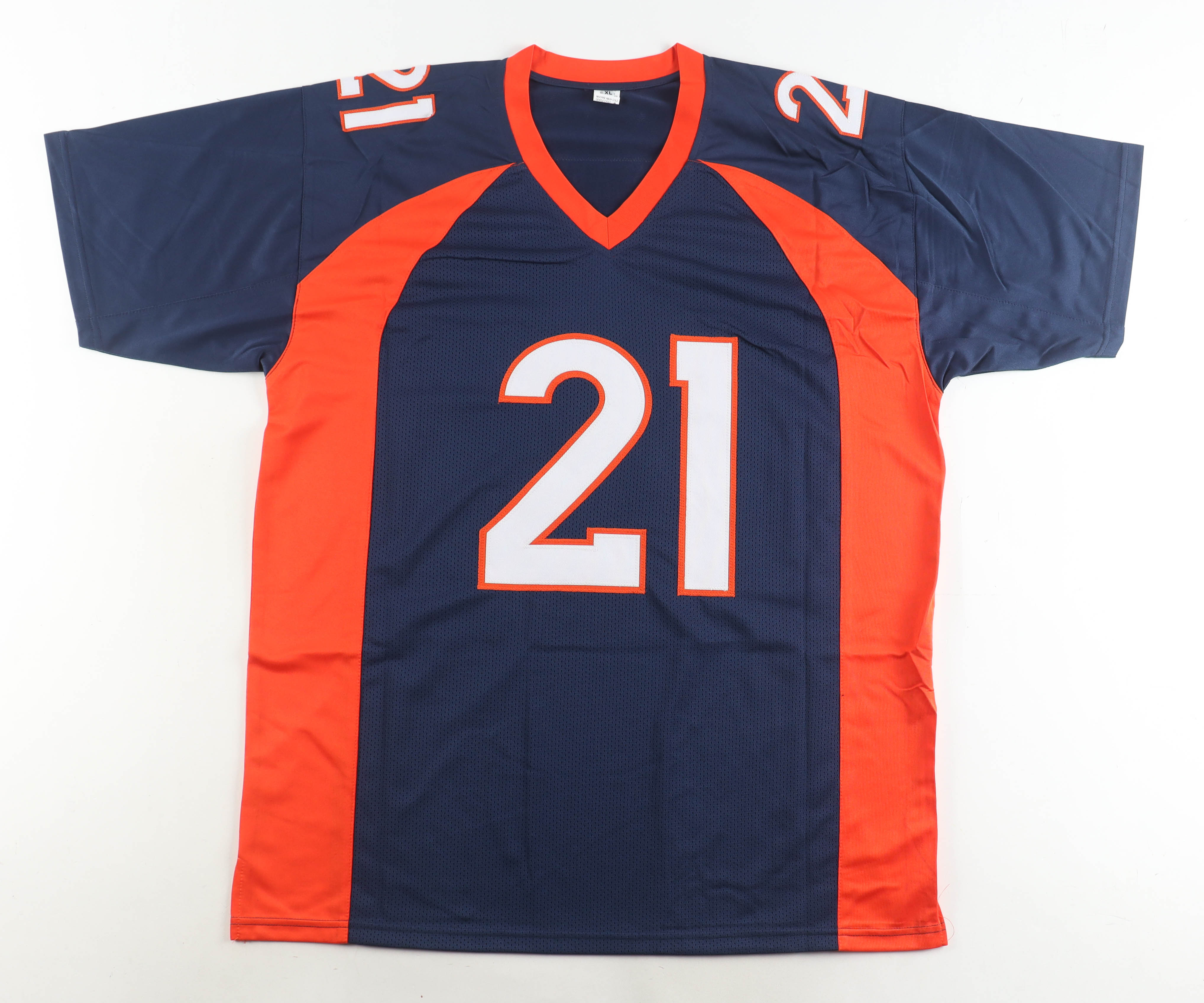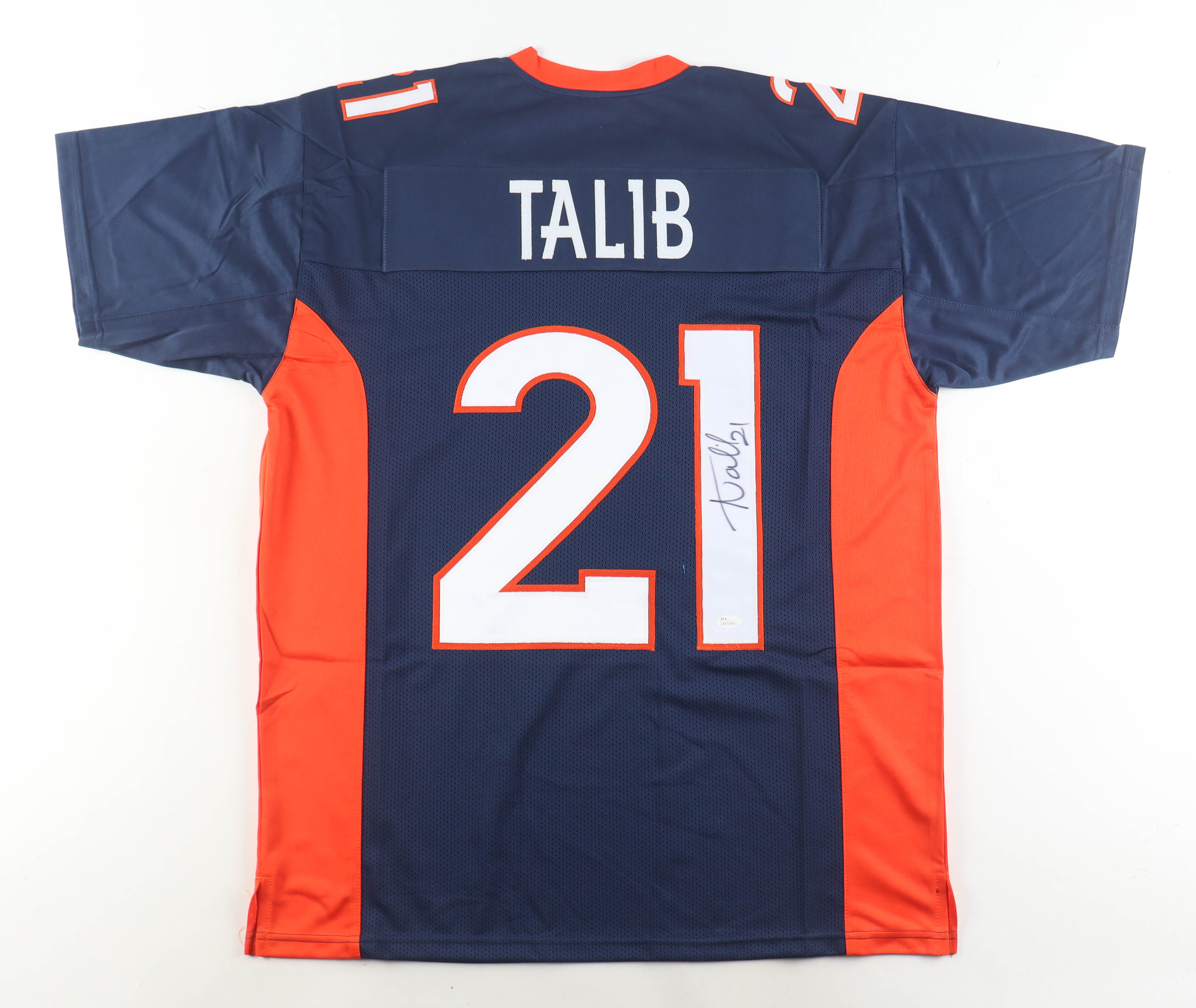 Custom jersey with everything sewn on, size XL. Hand-signed by Aqib Talib. Please note, the signature has bled.