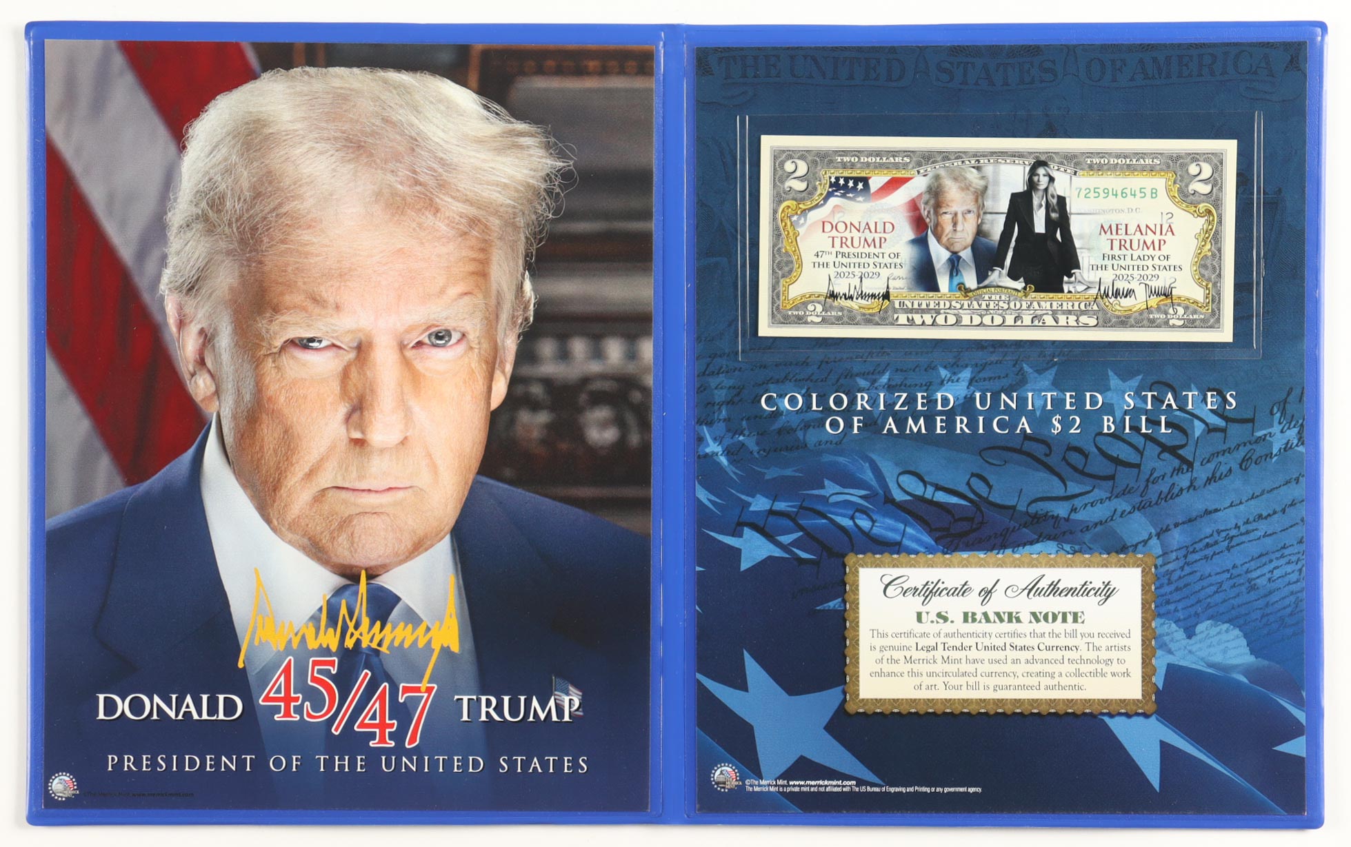 Donald Trump Genuine Legal Tender Colorized U.S. $2 Bill Commemorative Edition Bank Note. Includes folder as shown. Please note, the signature seen is a facsimile.