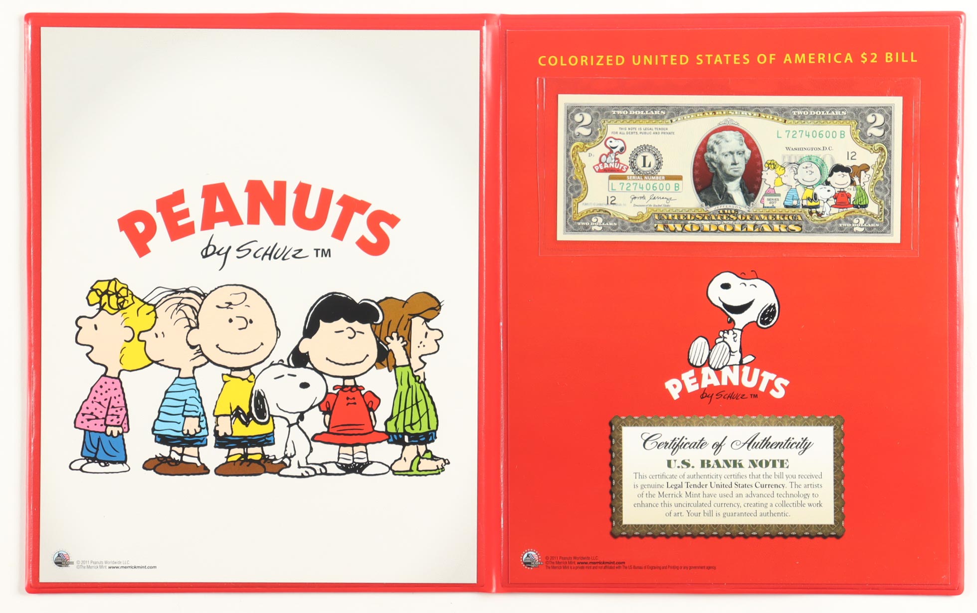 Peanuts Genuine Legal Tender Colorized U.S. $2.00 Two Dollar Bill Commemorative Edition Bank Note with Folder