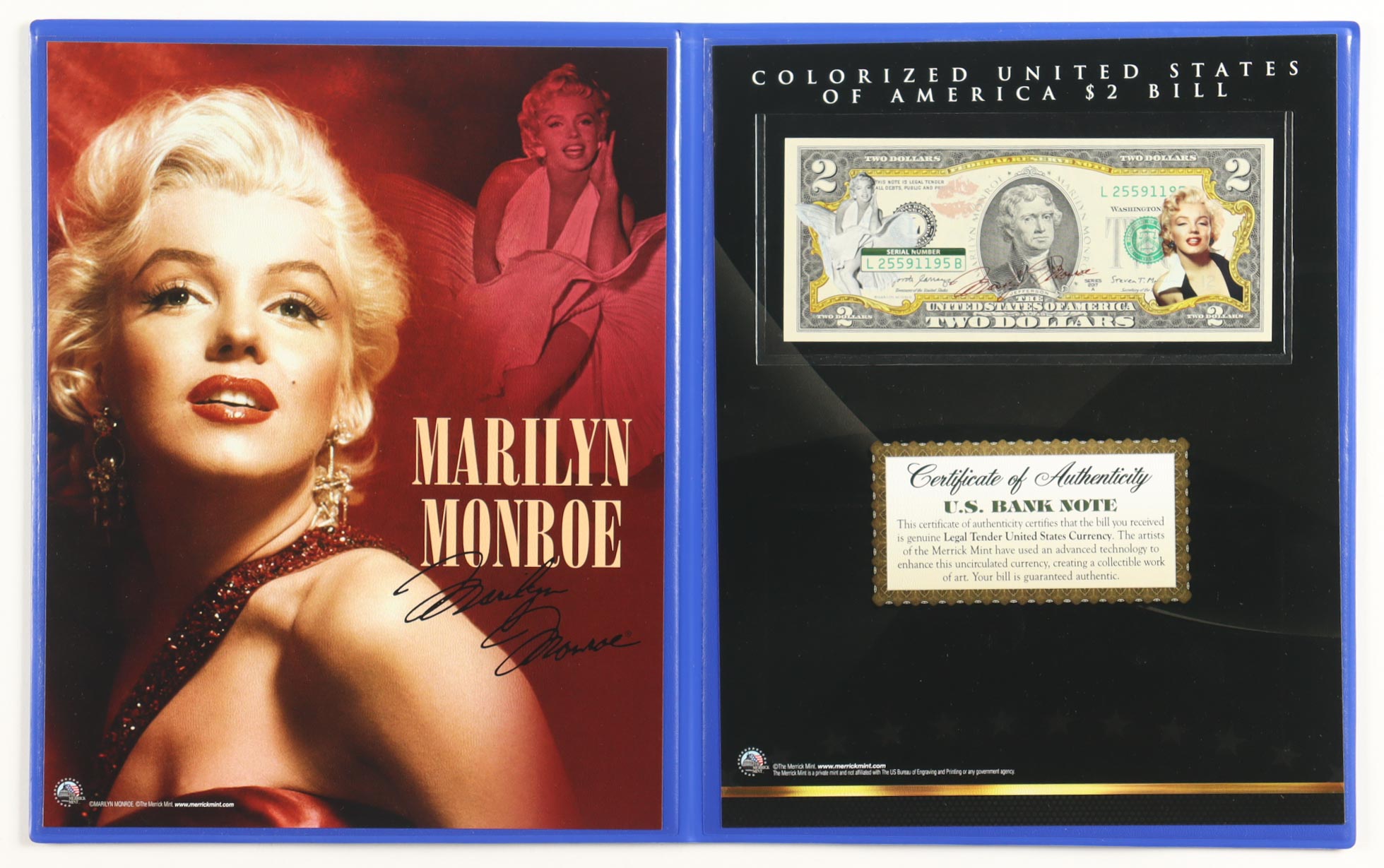 Marilyn Monroe Genuine Legal Tender Colorized U.S. $2 Bill Commemorative Edition Bank Note. Includes folder as shown. Please note, Monroe's autograph is a facsimile.