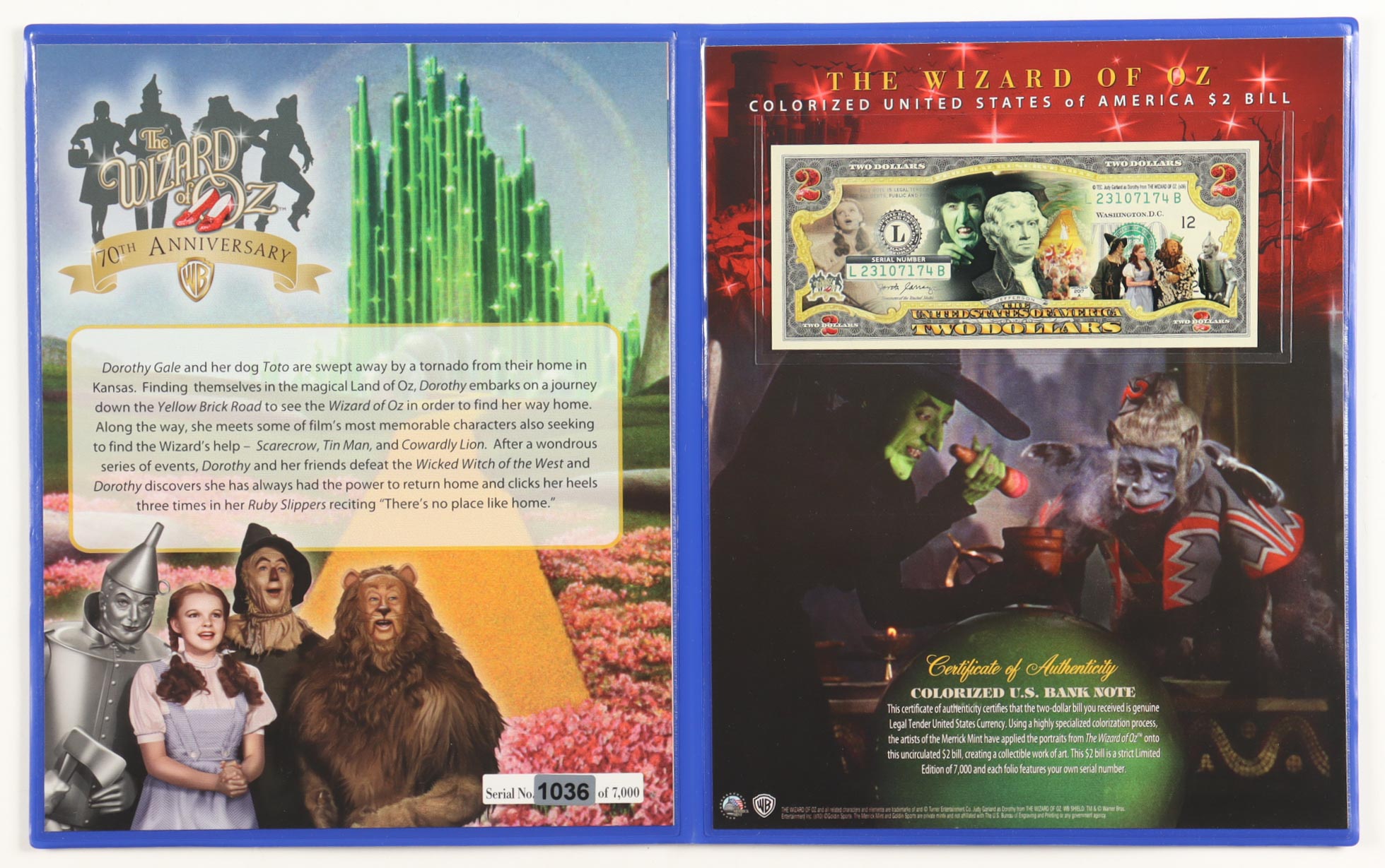 Wizard of Oz Genuine Legal Tender Colorized U.S. $2 Bill Commemorative Edition Bank Note. Includes folder as shown.