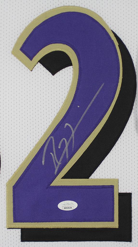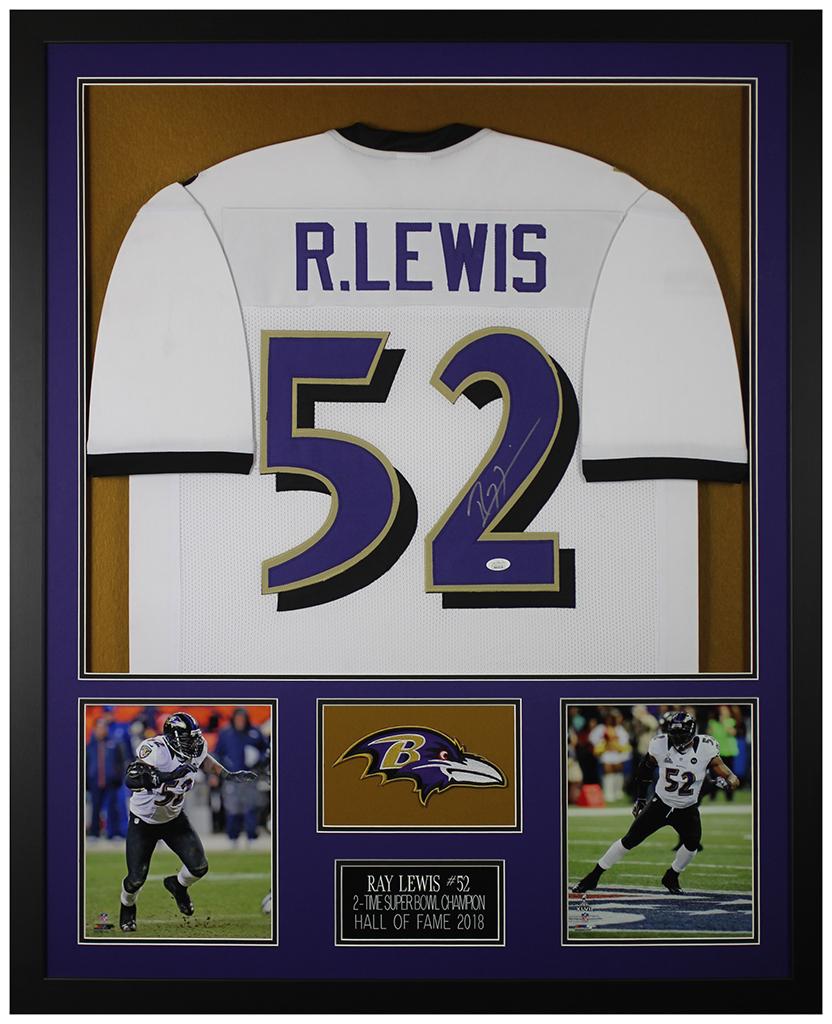 Custom frame measures 35" x 43" in size and features a jersey hand-signed by Ray Lewis (HOF).
