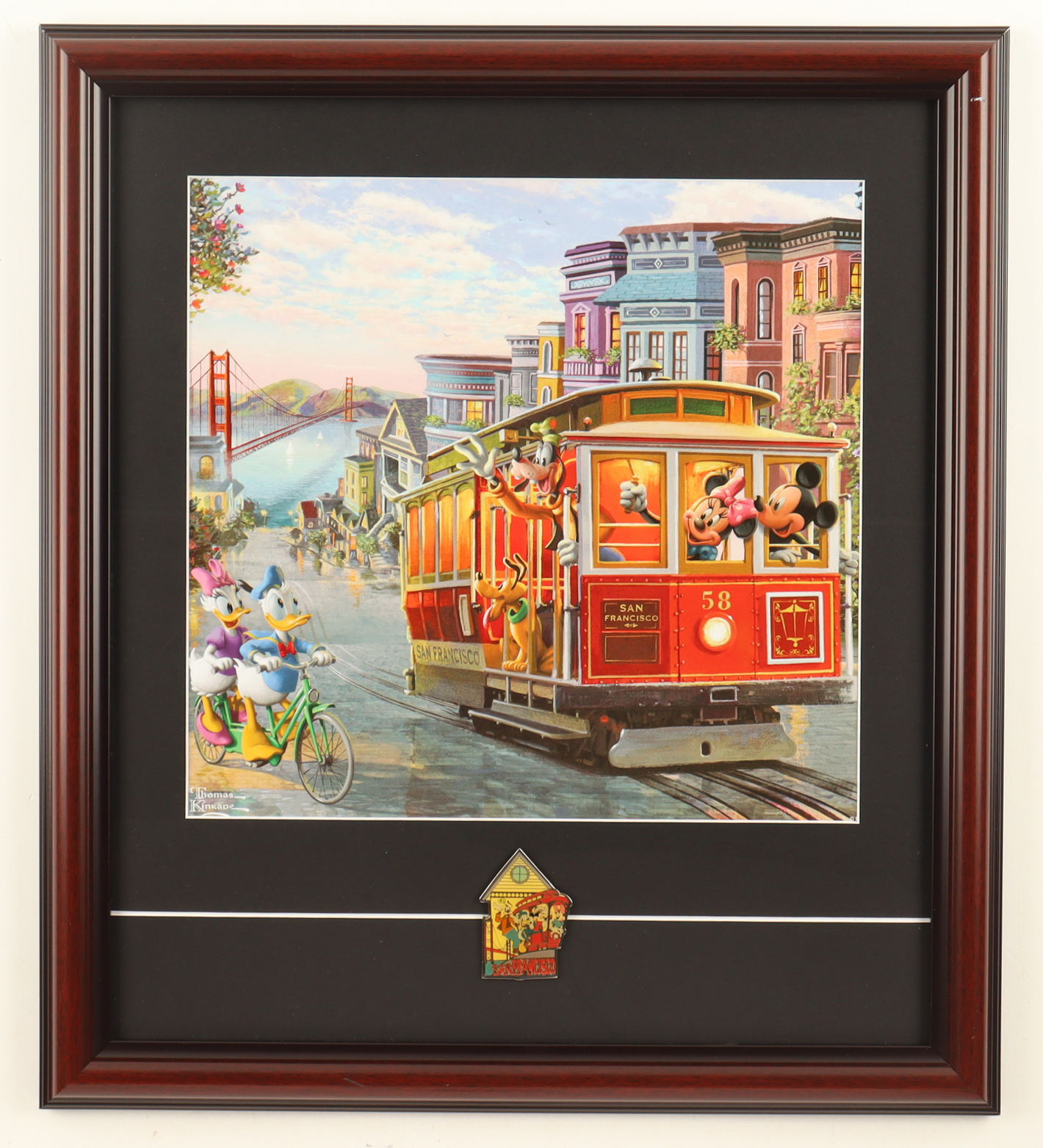 Thomas Kinkade "Mickey & Friends in San Fransisco" Custom Framed Print Display with Retired Vintage Multi Character Trolley Pin