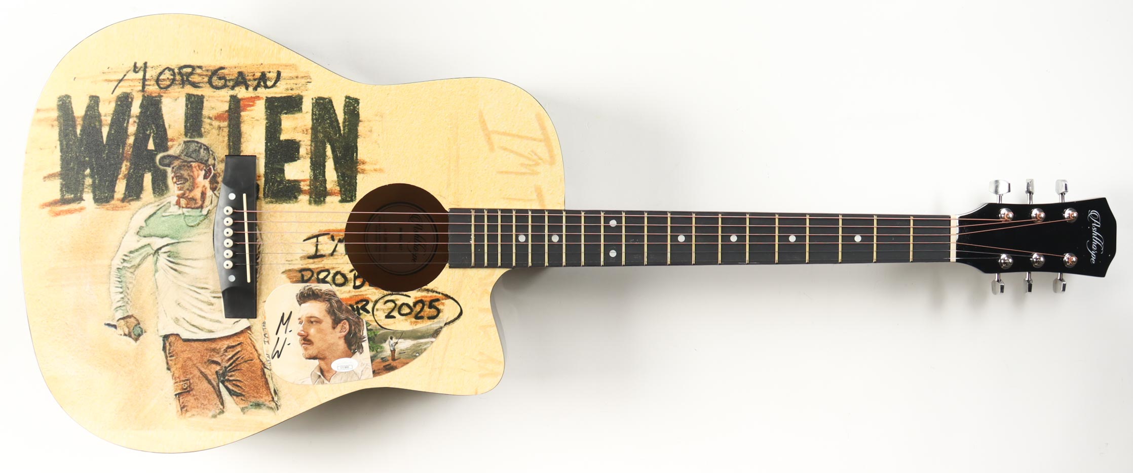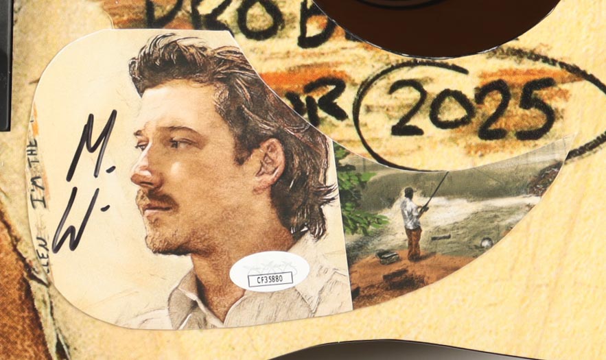 Acoustic guitar measures approximately 41" in length and has been hand-signed on a cut that has been repurposed as the pick-guard by Morgan Wallen.