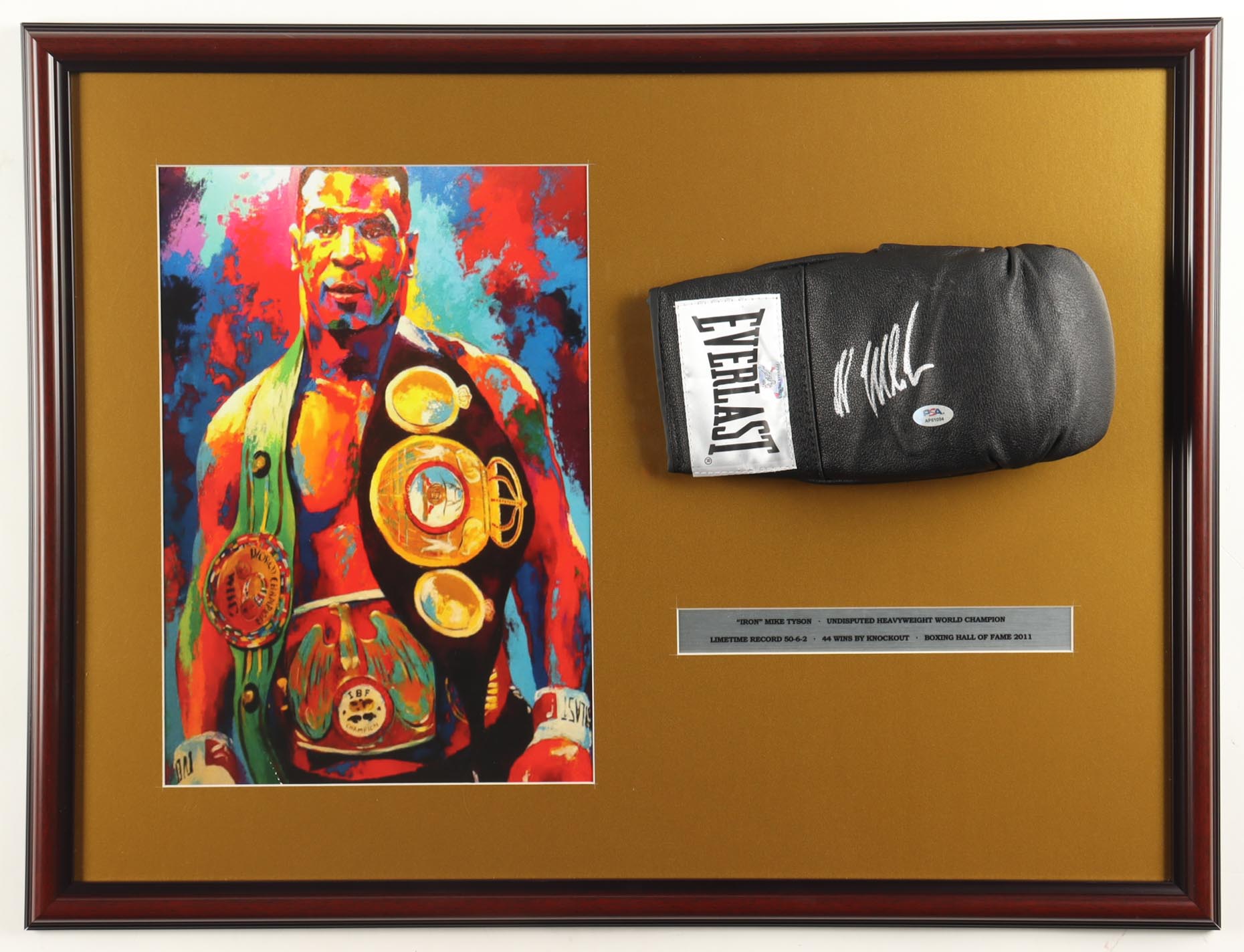 Custom frame measures 22" x 29" in size. Features a boxing glove that has been hand-signed by Mike Tyson (HOF). Display also includes an 11" x 14" art print and Tyson full career statistics plaque.