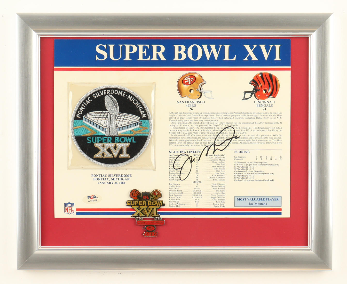 Custom frame measures approximately 13" x 16" in size. The display features a Super Bowl II Stat and Patch Card that has been hand-signed by Joe Montana (San Fransisco 49ers, HOF). Display also features a Super Bowl XVI pin.