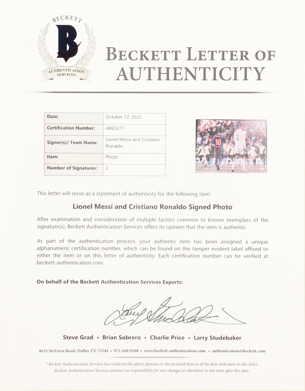 Photo measures 12" x 18" in size. Hand-signed by Christiano Ronaldo and Lionel Messi.