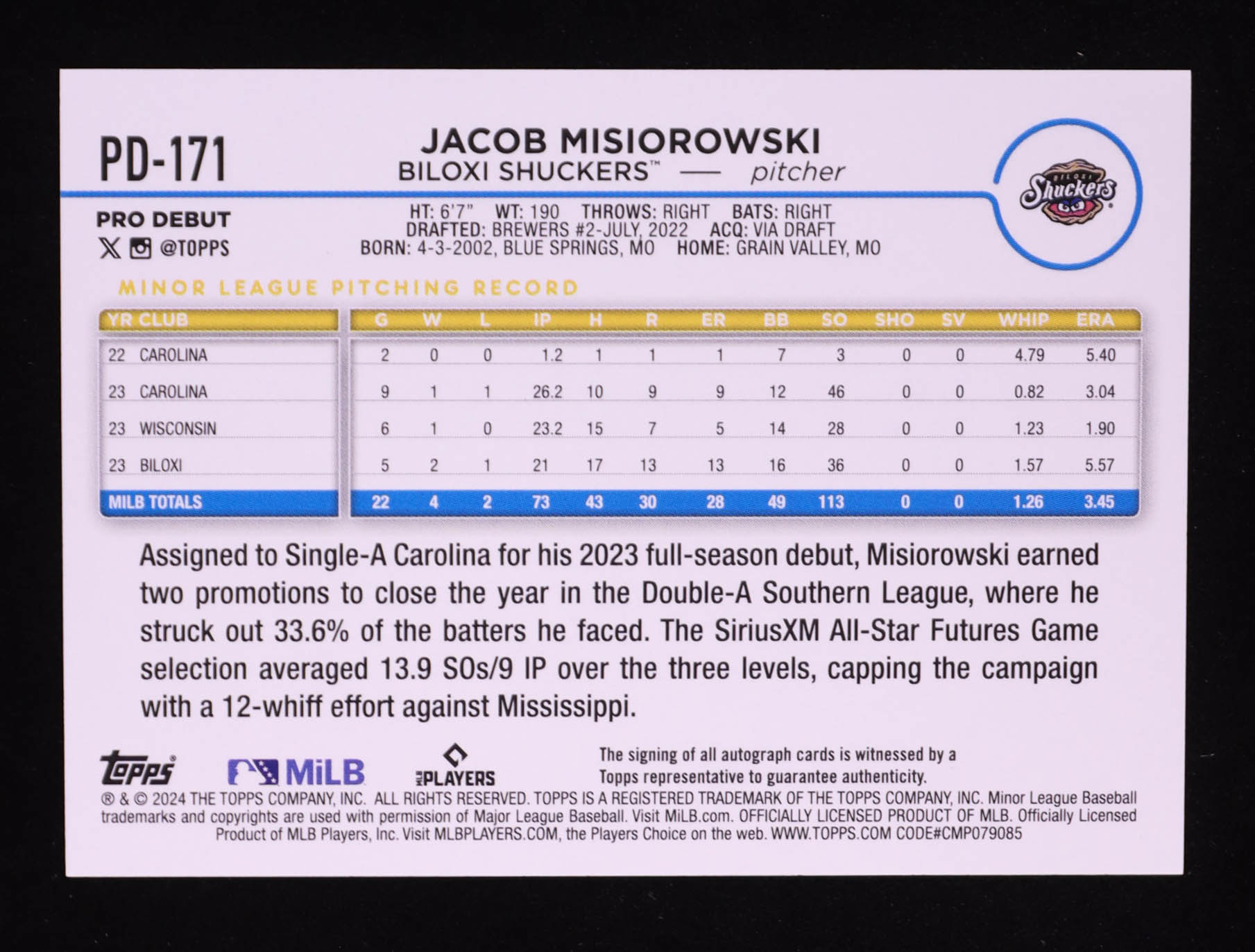 Jacob Misiorowski 2024 Topps Pro Debut Autographs #PD171 RC