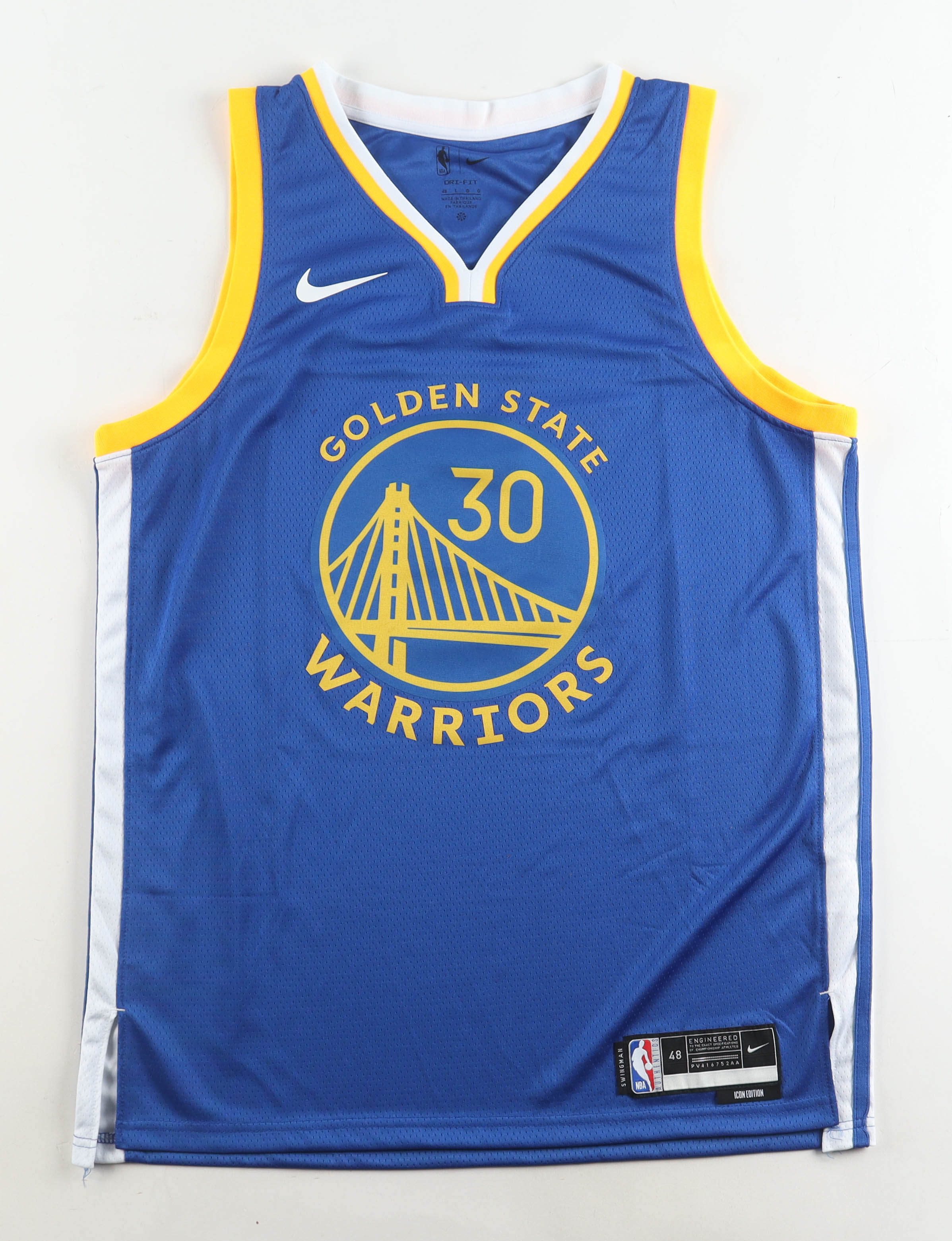 Nike authentic jersey with everything pressed on, size L. Hand-signed by Stephen Curry (Golden State Warriors).