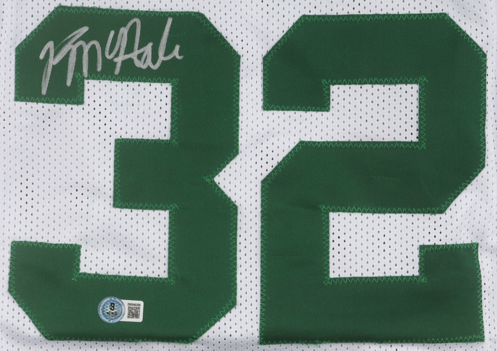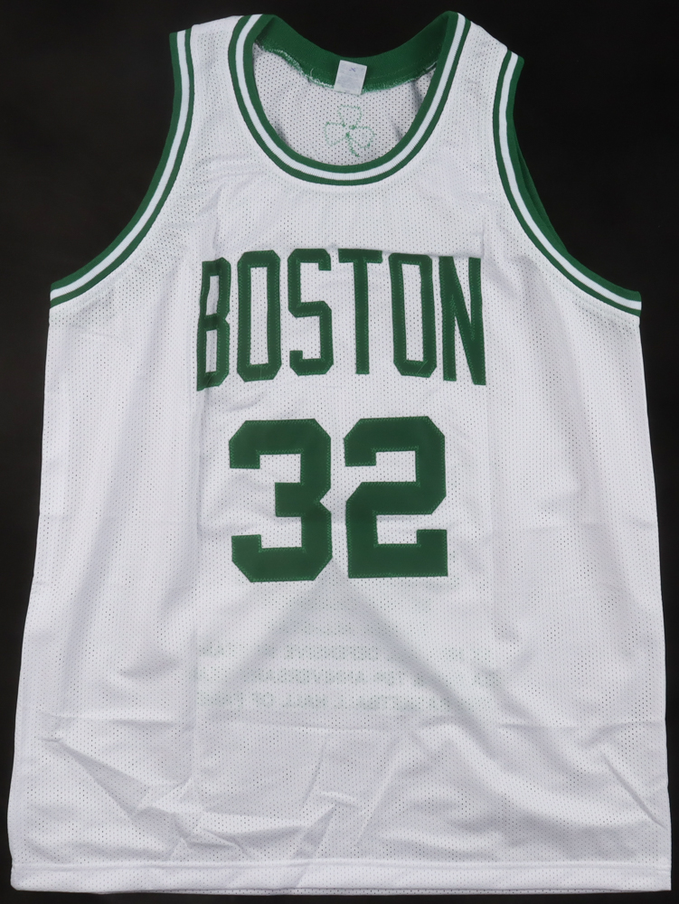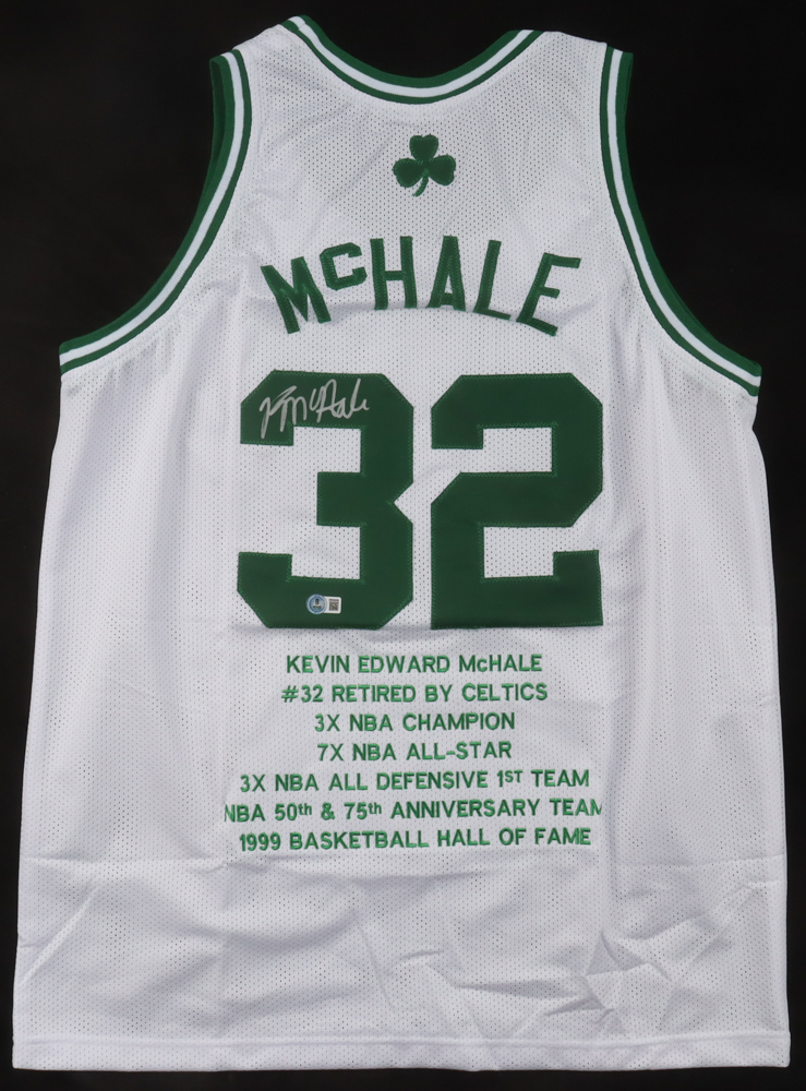 Custom jersey. Everything is sewn on, size XL. Hand-signed by Kevin McHale (HOF). McHale's career highlights have been stitched onto the back of the jersey below the reverse numbers.