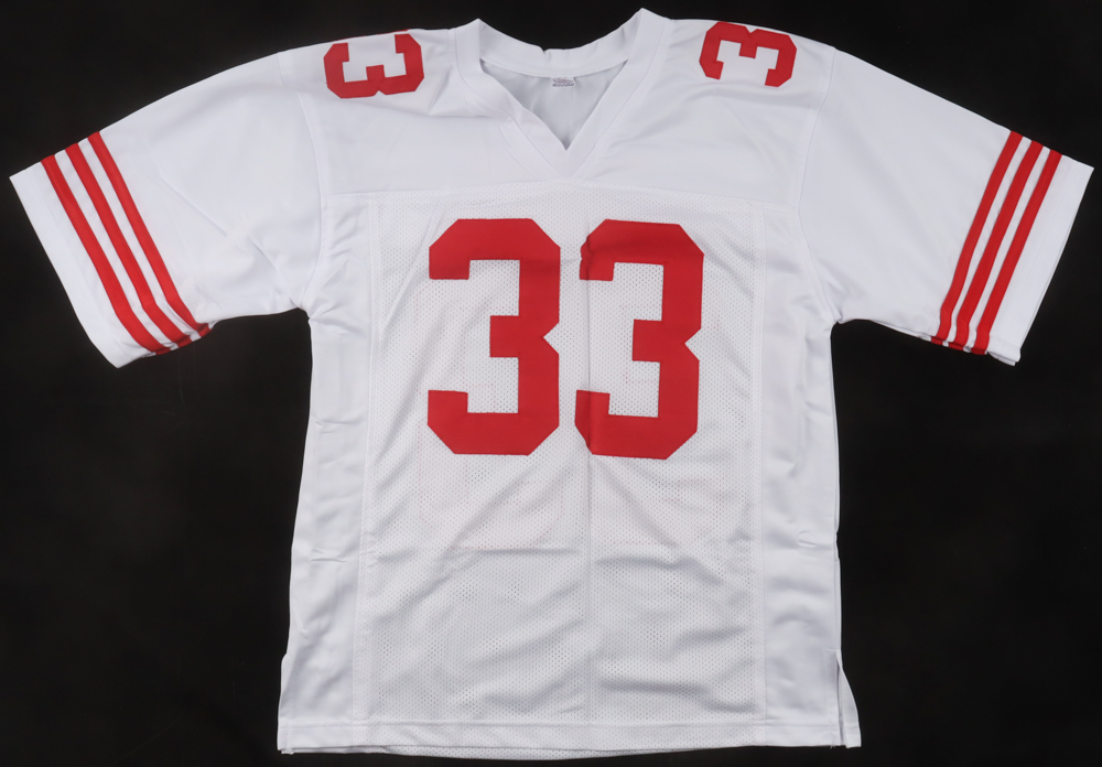 Custom jersey with everything sewn on, size XL. Hand-signed by Roger Craig.