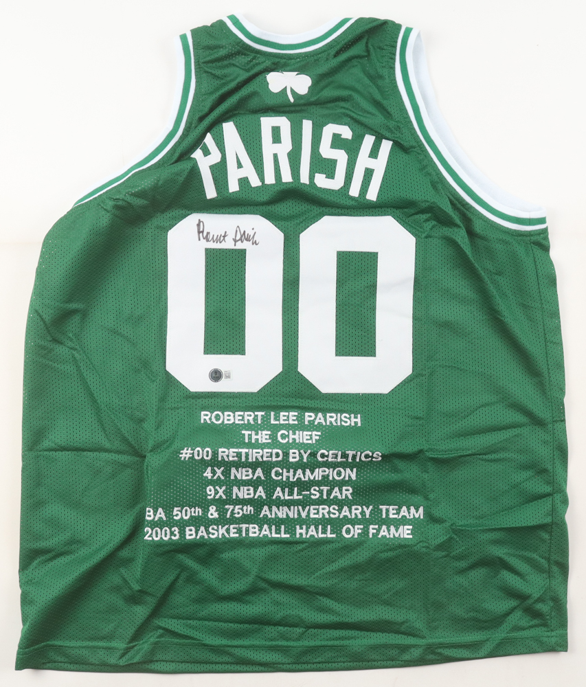 Custom jersey. Everything is sewn on, size XL. Hand-signed by Robert Parish (HOF). Parish's career highlights have been stitched onto the back of the jersey below the reverse numbers.