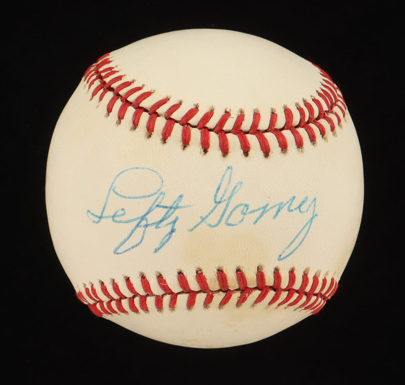 Rawlings Official American League Baseball. Hand-signed by Lefty Gomez (D. 1989, New York Yankees, HOF). Please note, the baseball is naturally toning and stained.