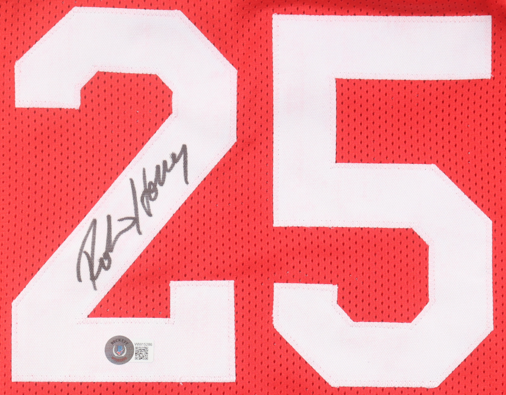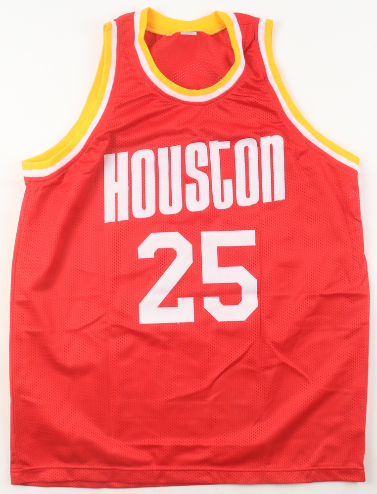 Custom jersey with everything sewn on, size XL. Hand-signed by Robert Horry. Please note, glue is visible through the reverse number.