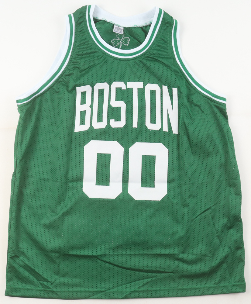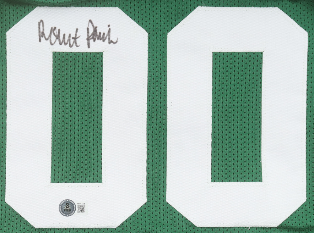 Custom jersey. Everything is sewn on, size XL. Hand-signed by Robert Parish (HOF). Parish's career highlights have been stitched onto the back of the jersey below the reverse numbers.