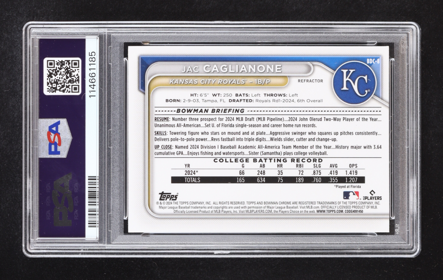 Jac Caglianone 2024 Bowman Chrome Draft Refractors #BDC8 RC (PSA 10)