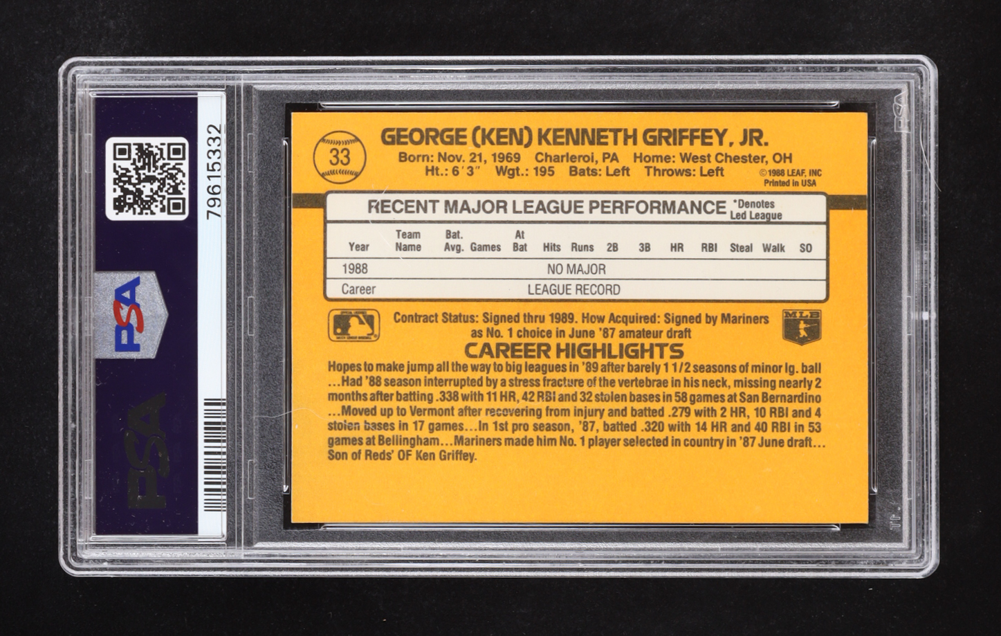Ken Griffey Jr. 1989 Donruss RR #33 RC (PSA 8)