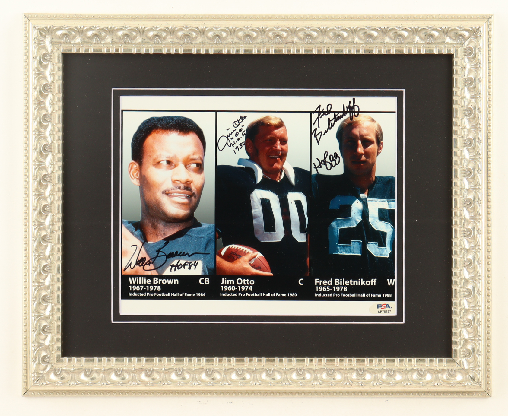 Frame measures approximately 13" x 16" in size. Featuring an 8" x 10" photo that has been hand-signed and inscribed by Willie Brown (D. 2019, Oakland Raiders, HOF), Jim Otto (D. 2024, Oakland Raiders, HOF) and Fred Biletnikoff (Oakland Raiders, HOF).