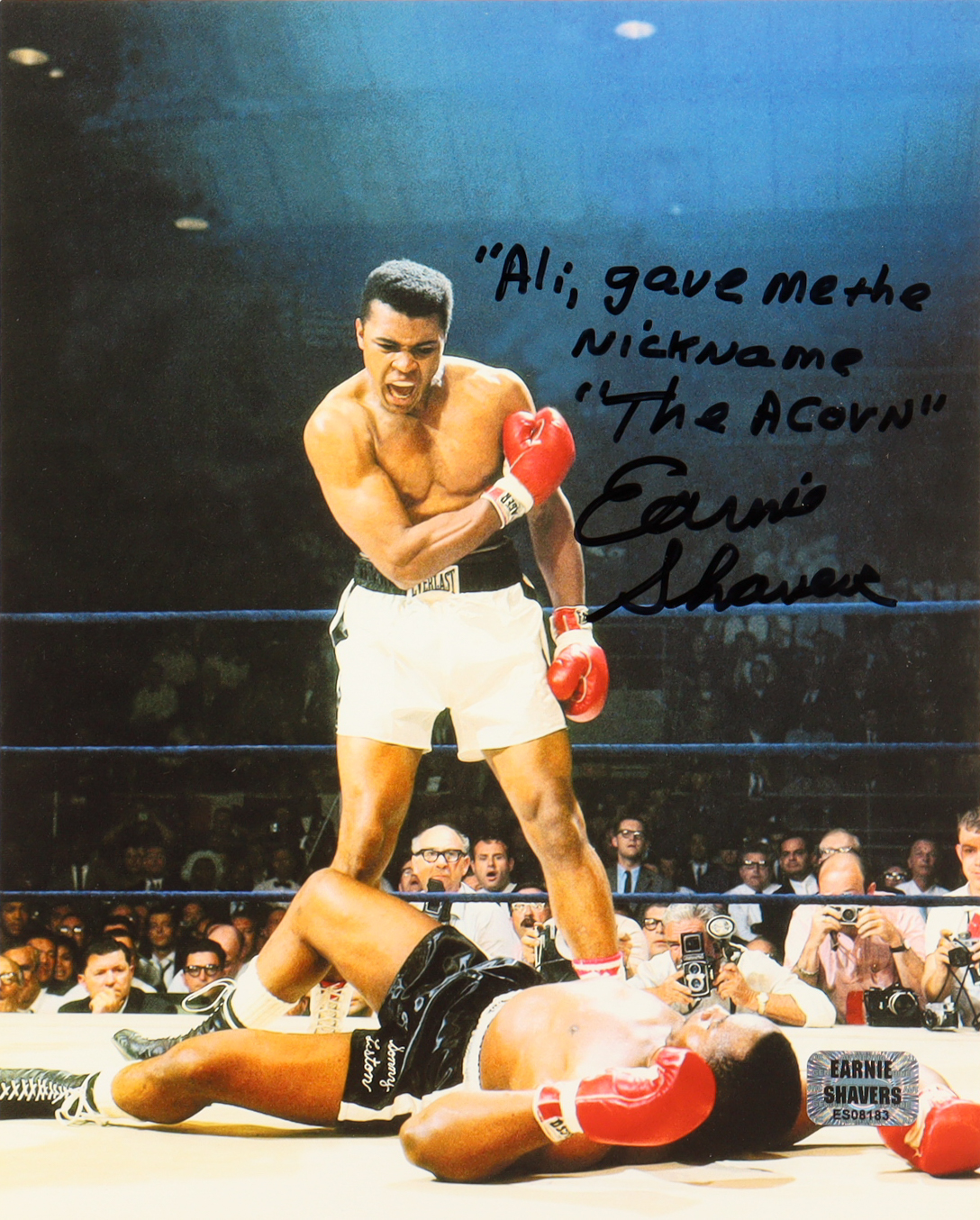 Photograph measures 8" x 10" in size. Hand-signed and inscribed by Earnie Shavers (d. 2022).