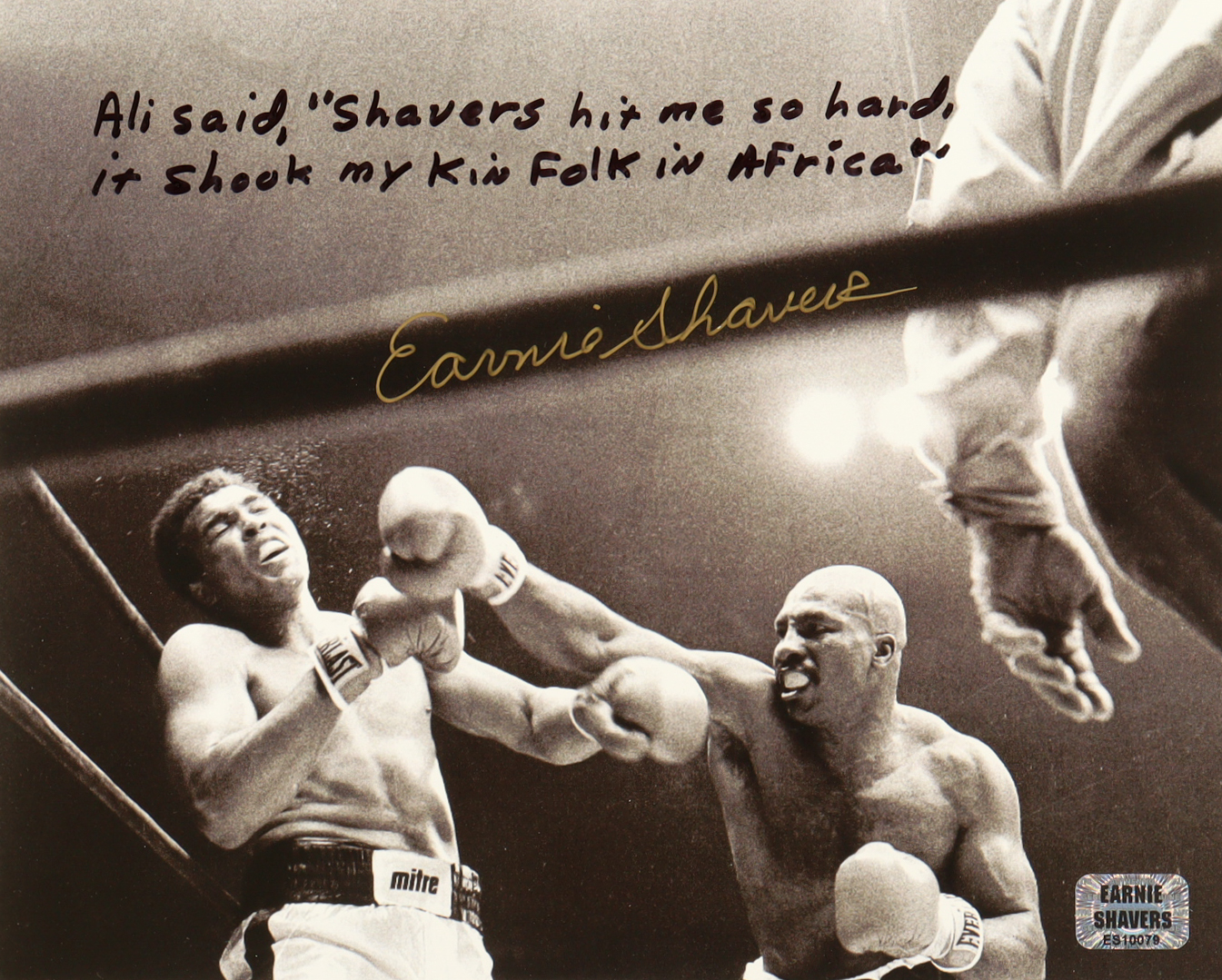 Photograph measures 8" x 10" in size. Hand-signed and inscribed by Earnie Shavers (d. 2022).