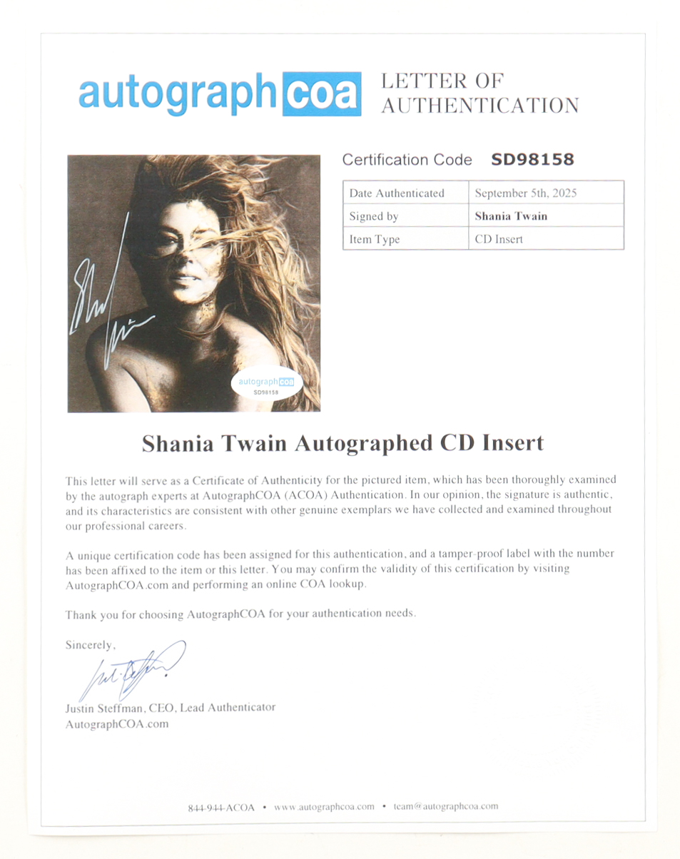 Matted insert display measures approximately 8" x 13.5" in size. Features a CD insert that has been hand-signed by Shania Twain. Please note, the CD is included. Refer to photos for more details.