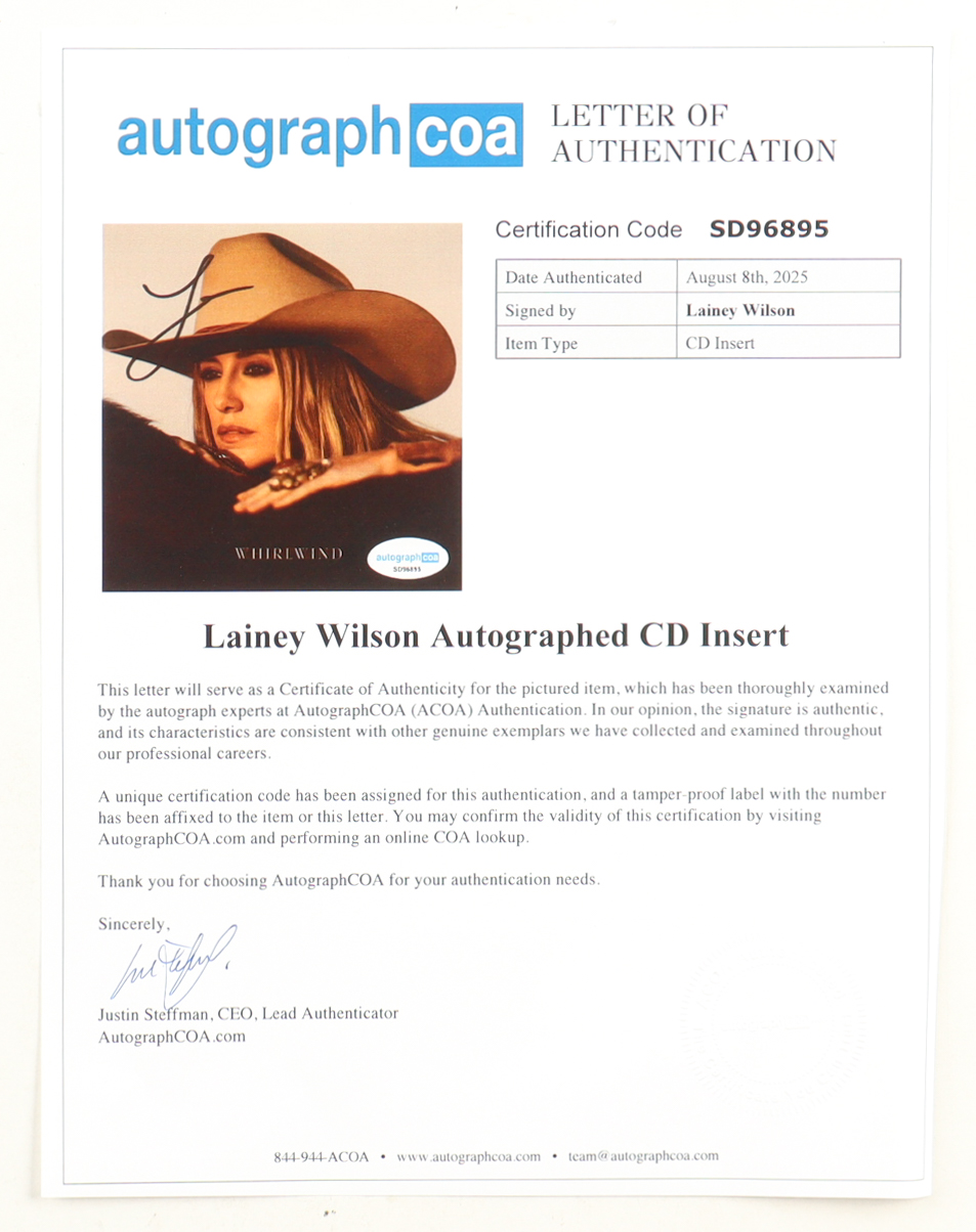 Matted insert display measures approximately 8" x 13.5" in size. Features a CD insert that has been hand-signed by Lainey Wilson. Please note, the CD is included. Refer to photos for more details.