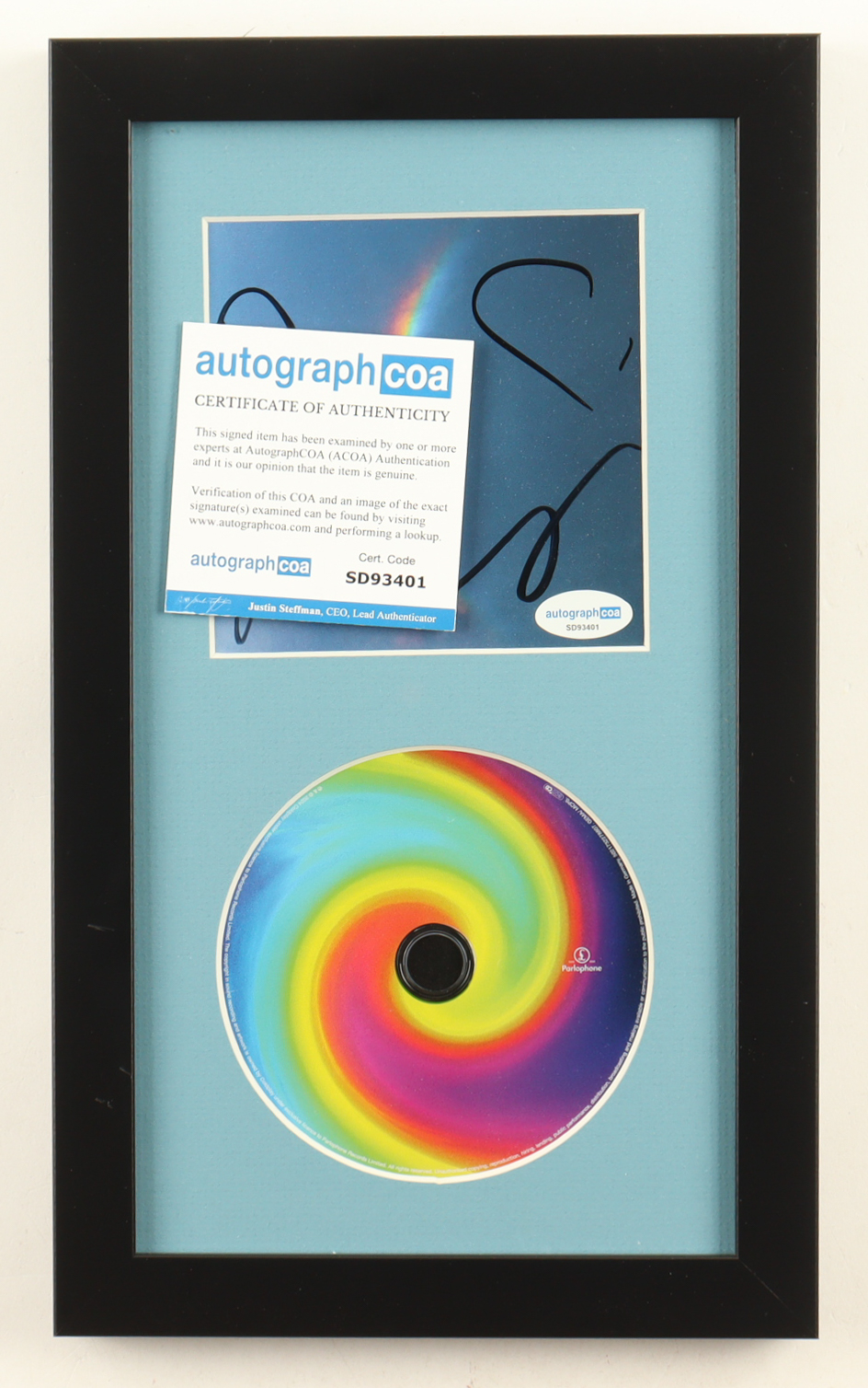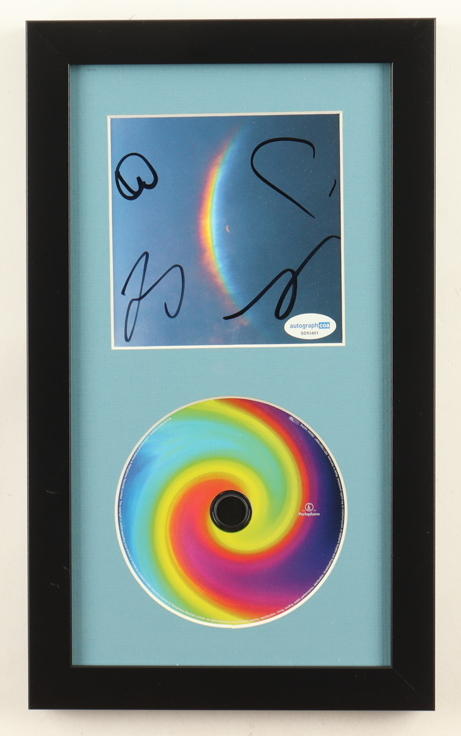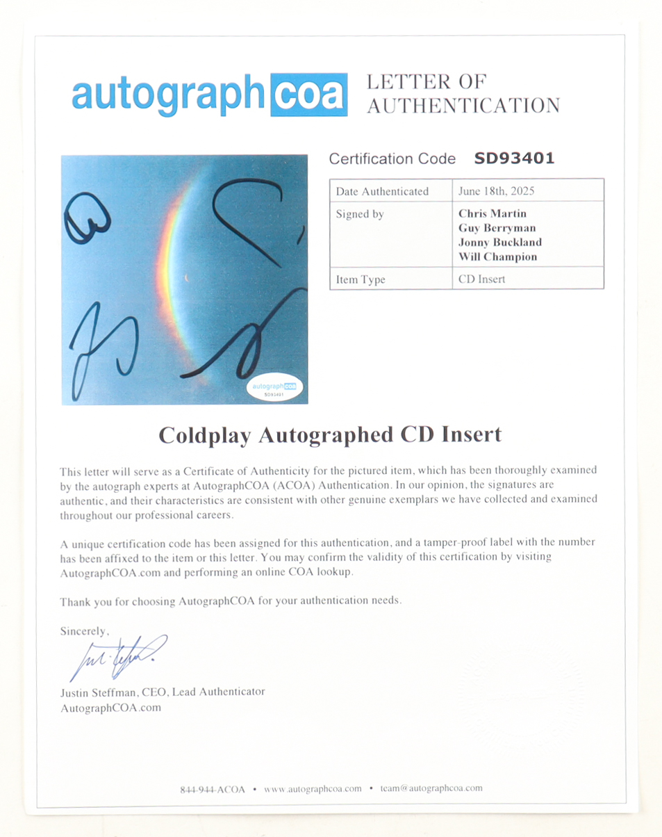 Matted insert display measures approximately 8" x 13.5" in size. Features a CD insert that has been Band-Signed By (4) with Chris Martin, Guy Berryman, Jonny Buckland, and Will Champion. Please note, the CD is included. Refer to photos for more details.