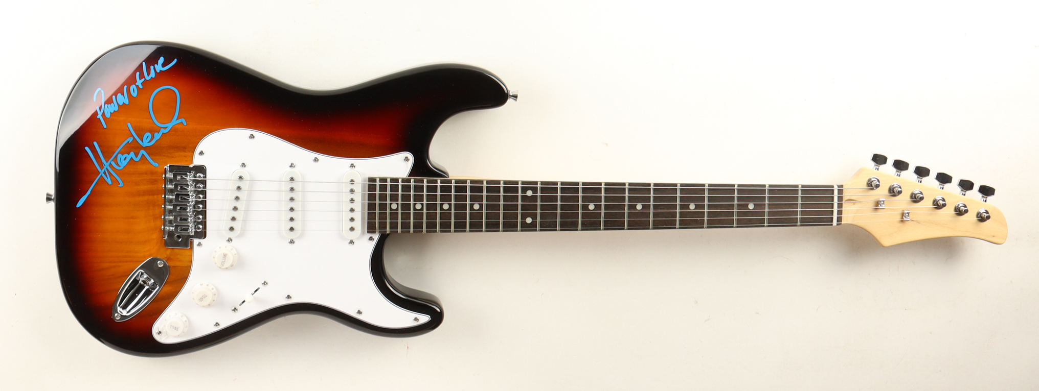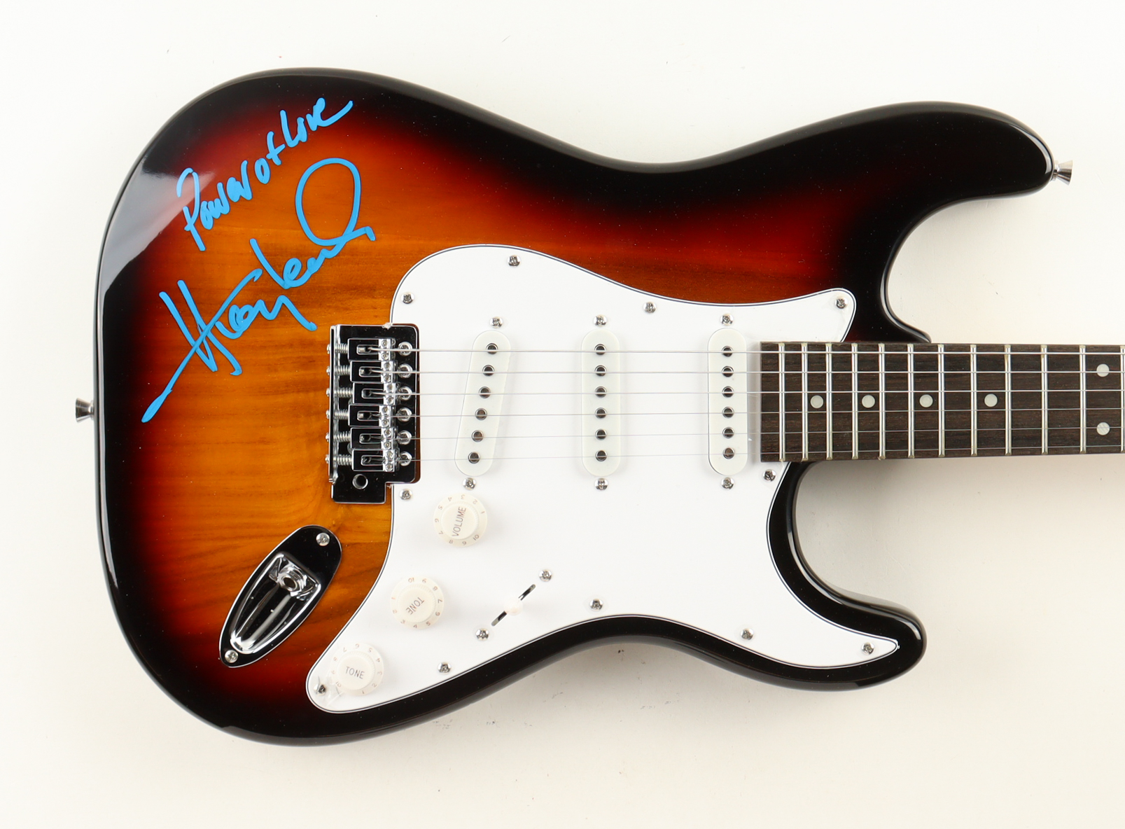 Stratocaster style electric guitar measures approximately 39" in length and has been hand-signed and inscribed on the base by Huey Lewis (Huey Lewis & The News).