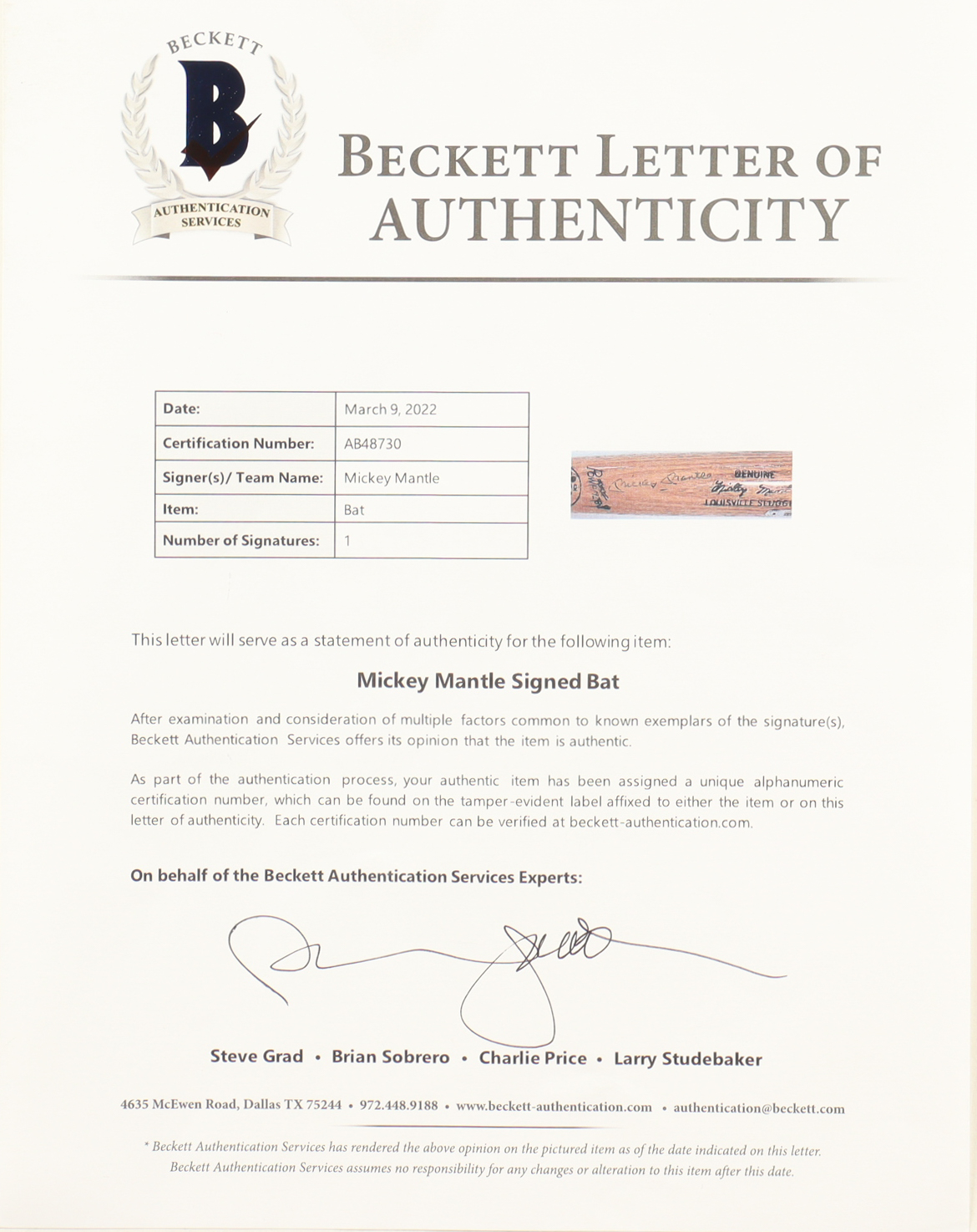 The autograph includes an official Beckett Authentication Services hologram and matching LOA for authenticity purposes.