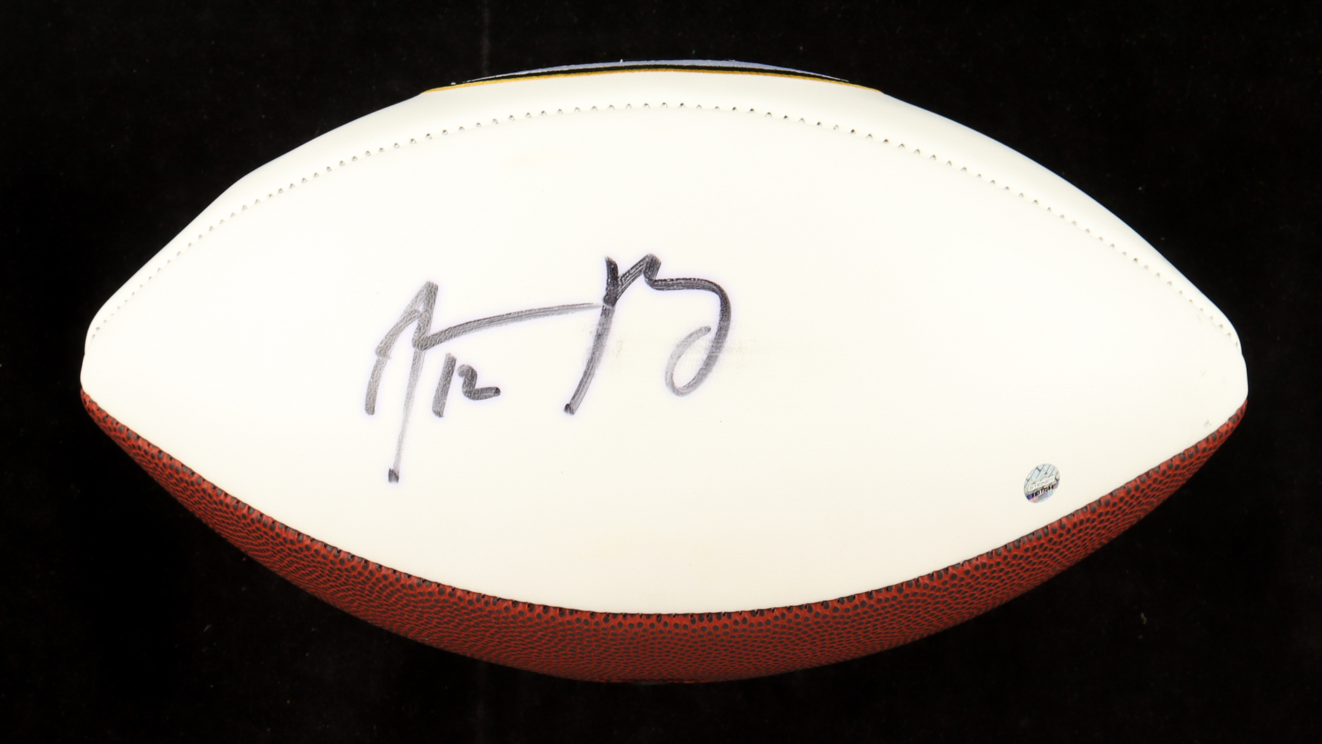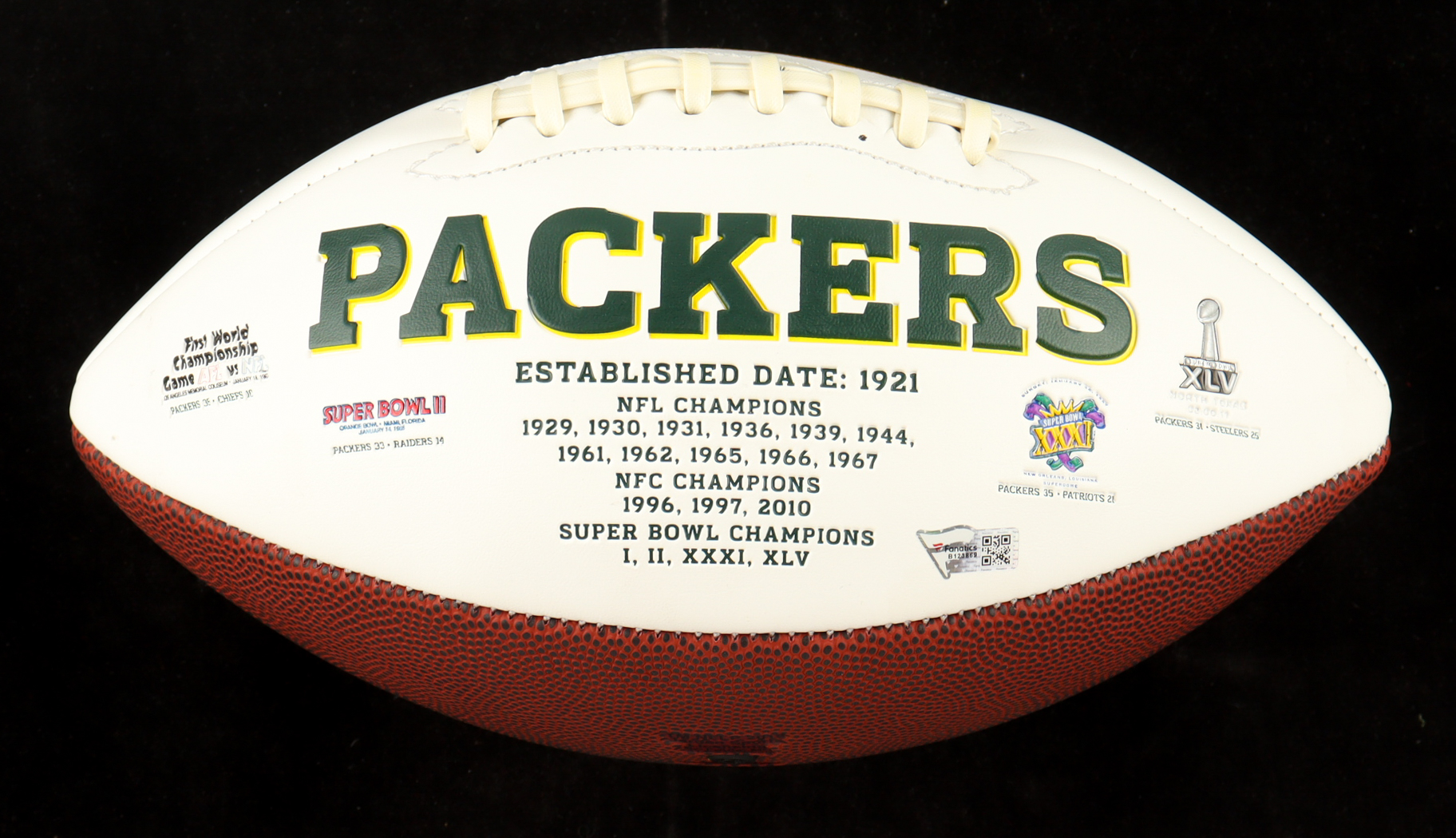Green Bay Packers Logo White Panel Football has been hand-signed by Aaron Rodgers.