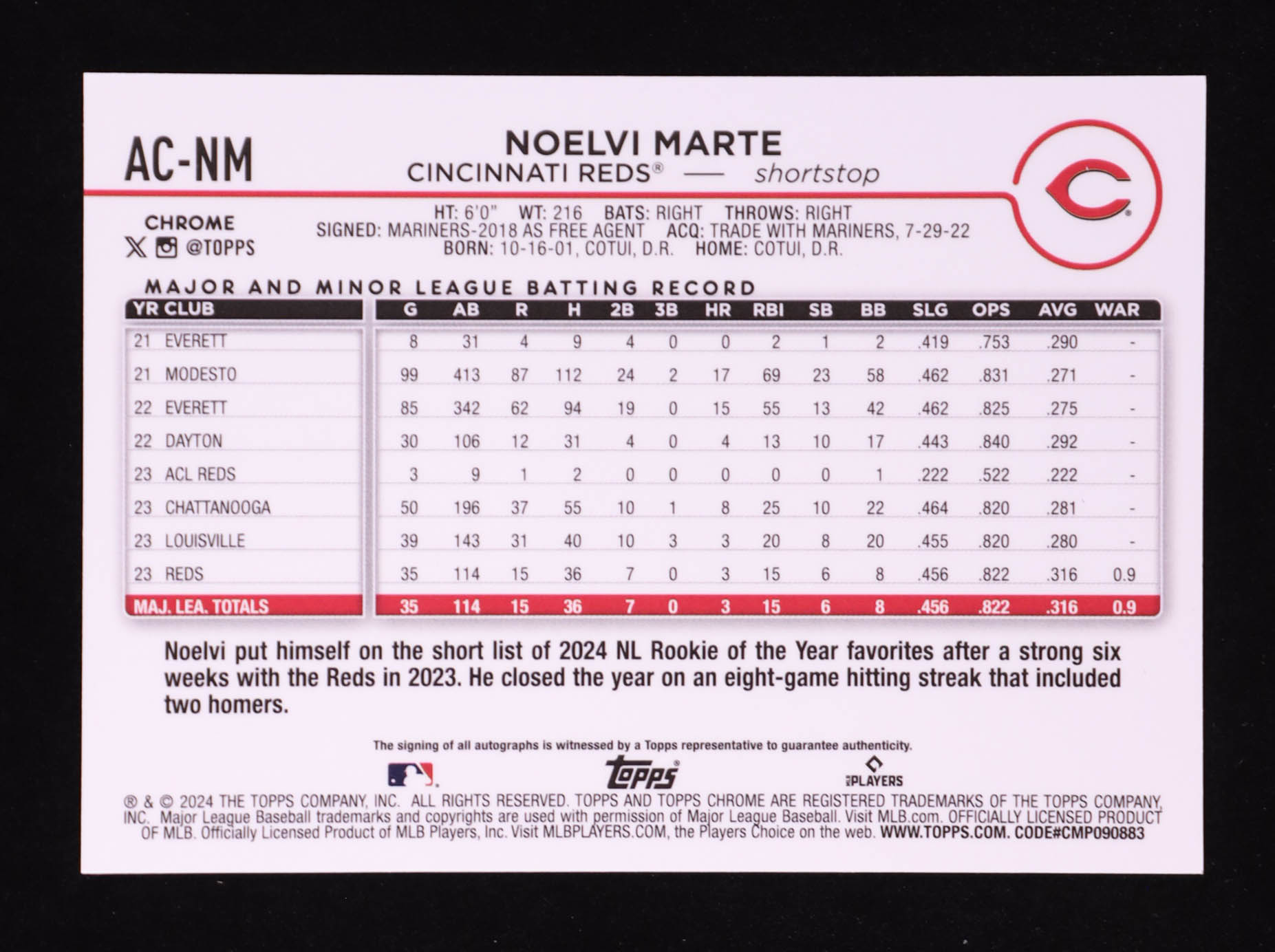 Noelvi Marte 2024 Topps Chrome Update Autographs Purple Speckle Refractors #ACNM RC #225/299