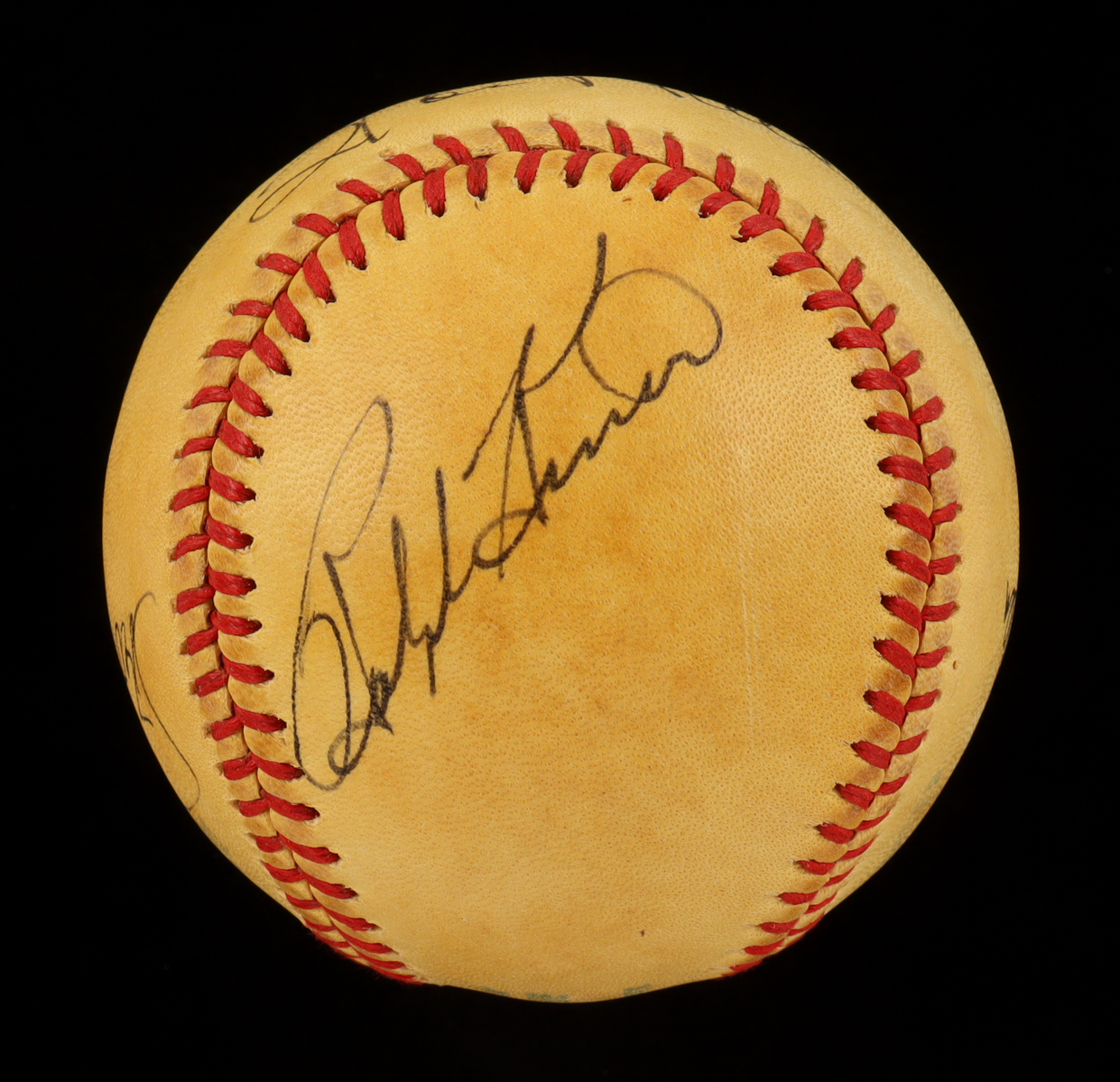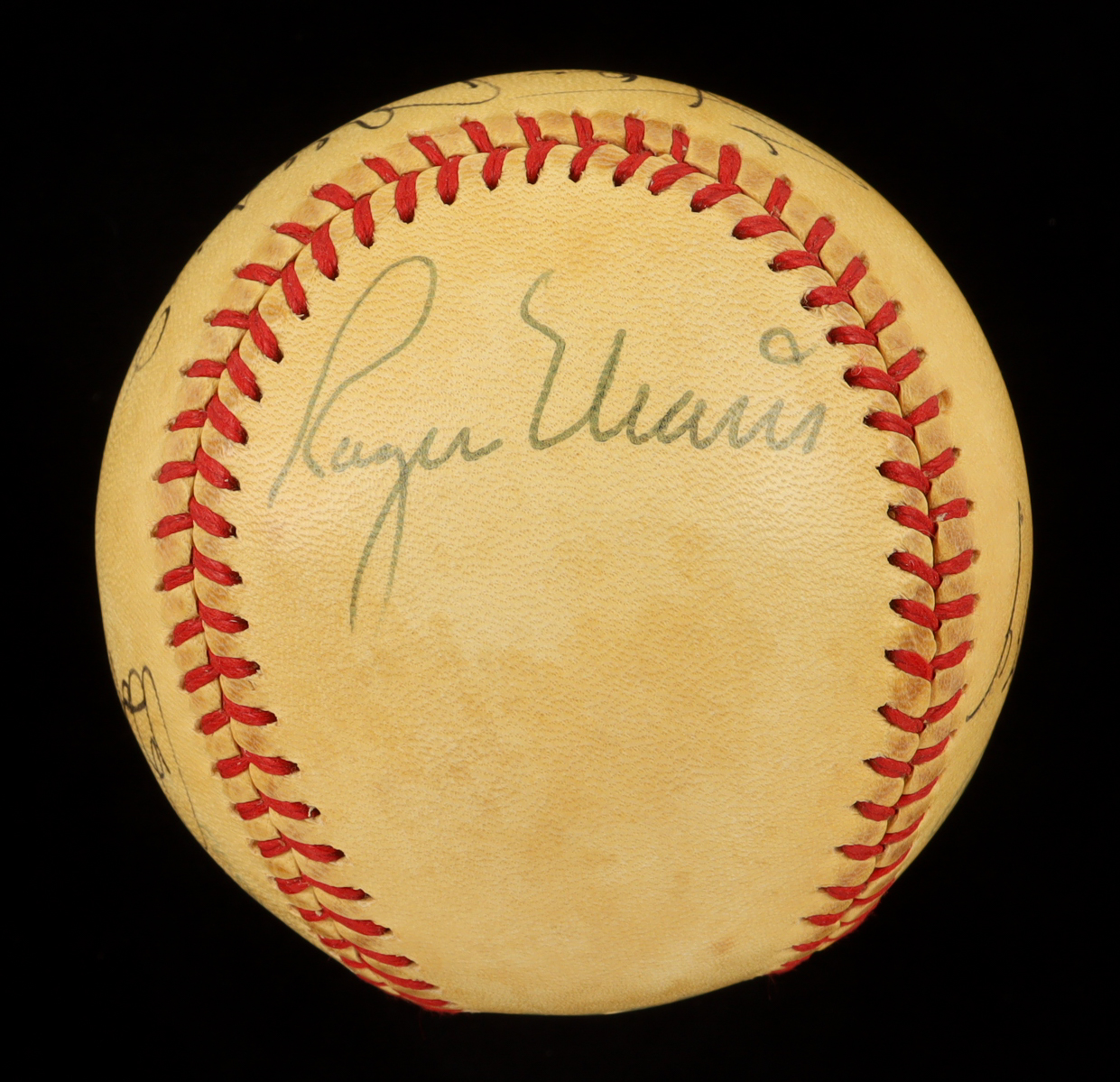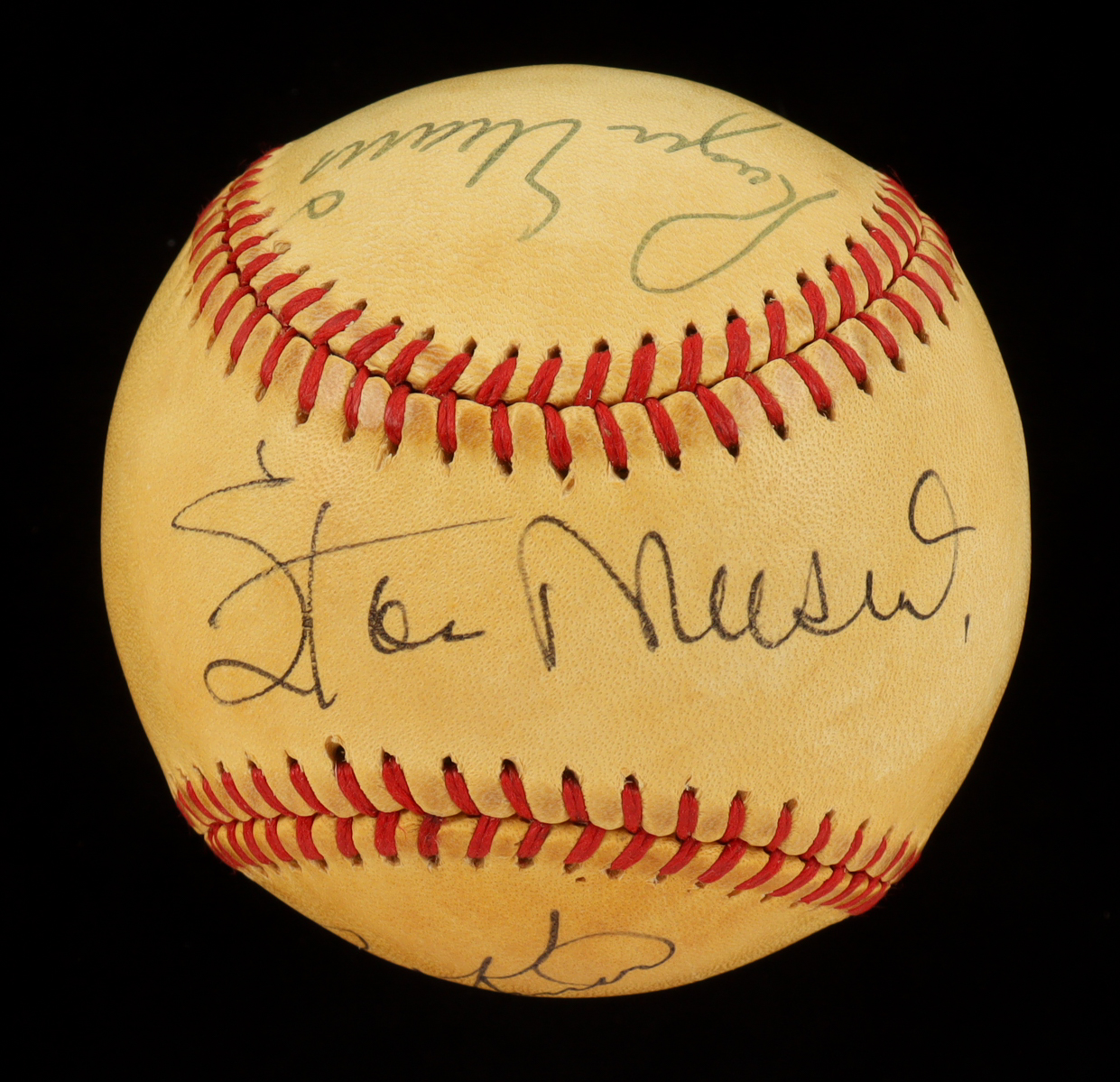 Rawlings Official American League baseball. Hand-signed by Stan Musial, Steve Garvey, Ralph Kiner, Bob Feller, and Roger Maris.