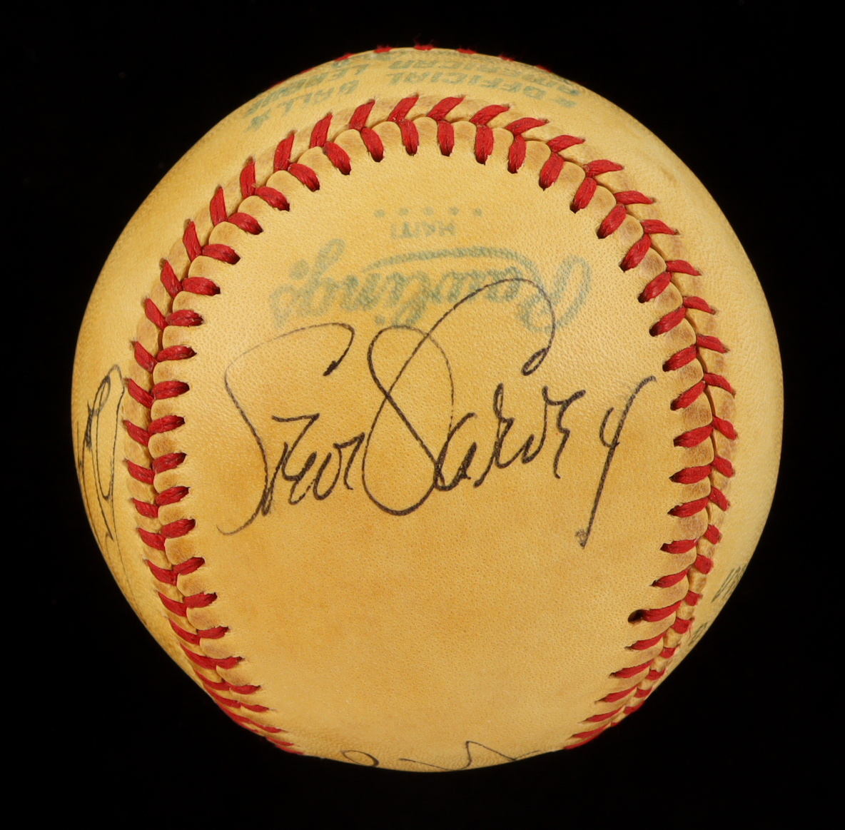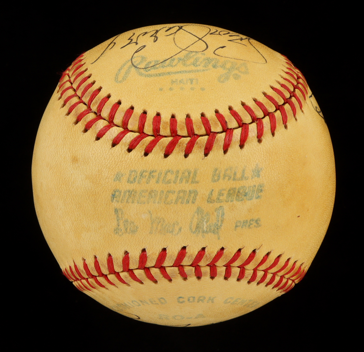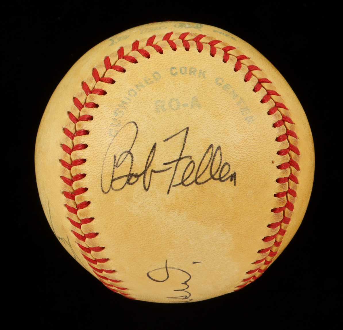 Rawlings Official American League baseball. Hand-signed by Stan Musial, Steve Garvey, Ralph Kiner, Bob Feller, and Roger Maris.