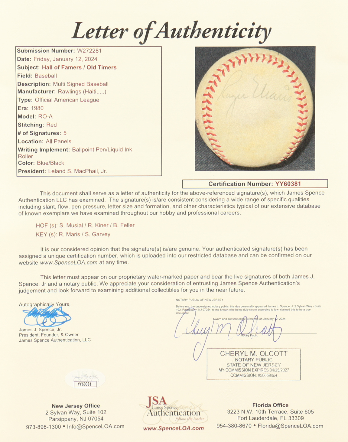 Hall of Famers & Old Timers OAL Baseball Signed by (5) with Stan Musial, Steve Garvey (JSA)