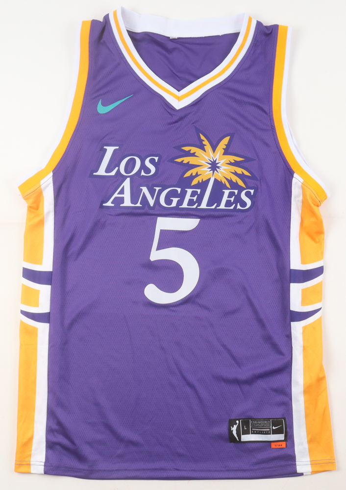 Nike authentic jersey with everything pressed on, size L. Hand-signed by Dearica Hamby (Los Angeles Sparks).