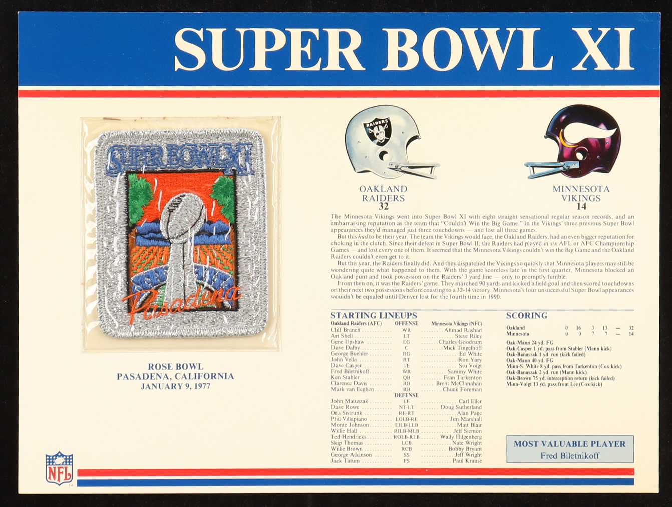Super Bowl XI Stat and Patch Card. Please see photos regarding the details of the item. Note that the item is unsigned.