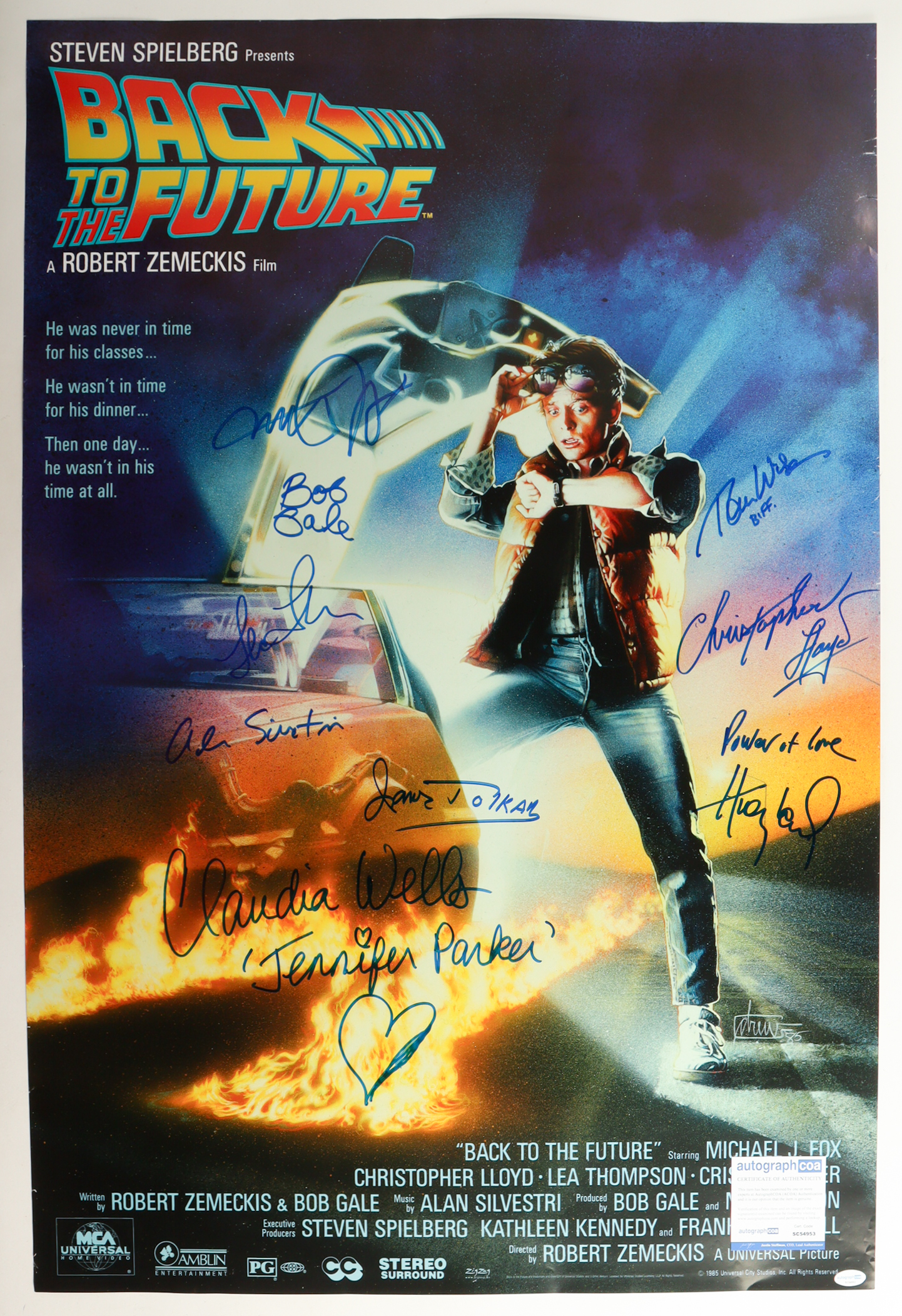 Poster measures approximately 27" x 40" in size and has been hand-signed and inscribed by (5) With Michael J. Fox (Marty McFly), Christopher Lloyd (Dr. Emmett Brown), Lea Thompson (Lorraine Baines), Tom Wilson (Biff Tannen), Claudia Wells (Jennifer Parker), Alan Silvestri (Score composer), Bob Gale (Writer) Huey Lewis, and James Tolkan (Mr. Strickland). Please note there is damage to the bottom corners and edges, see photos for more details.