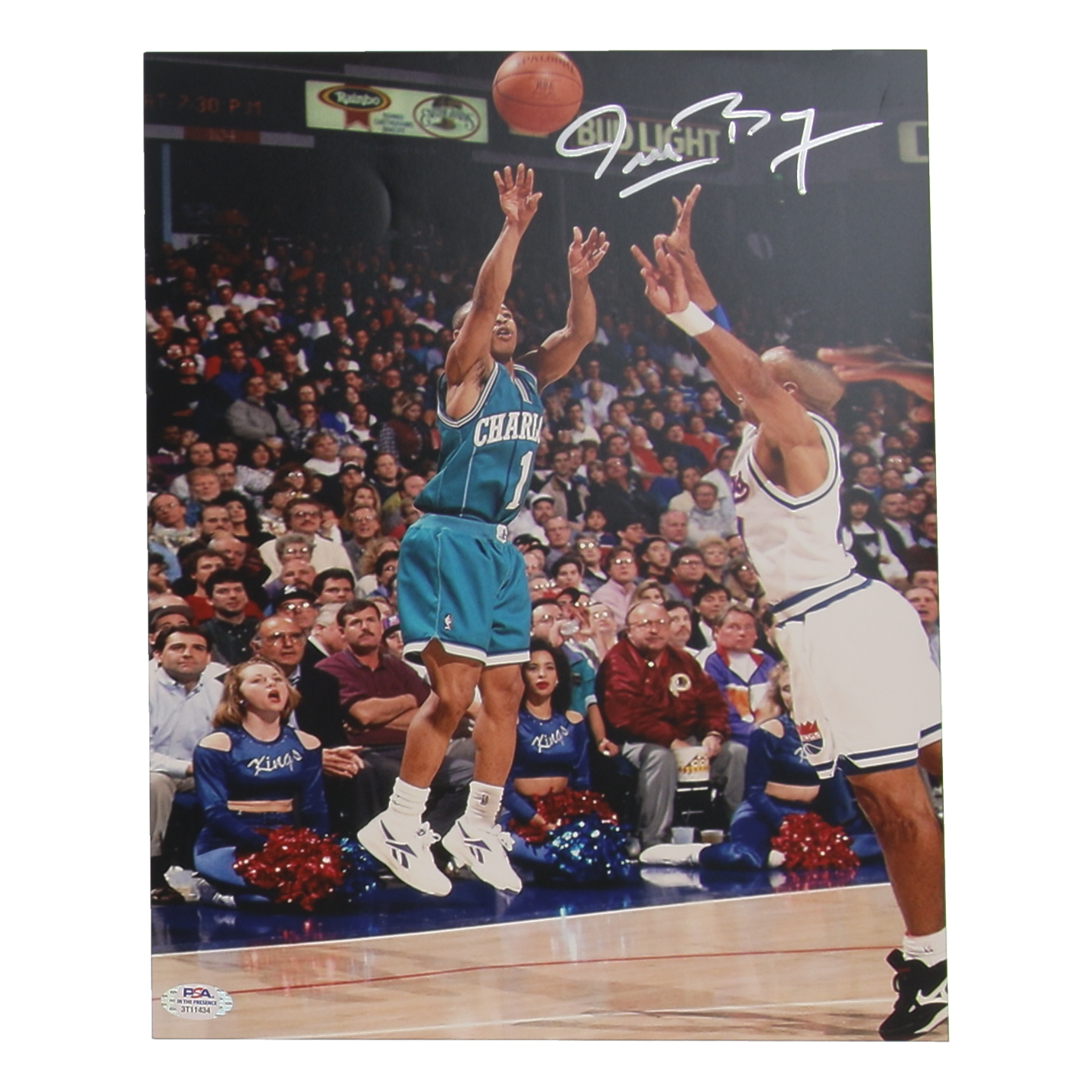Photo measures 11" x 14" in size. Hand-signed by Muggsy Bogues (Charlotte Hornets).
