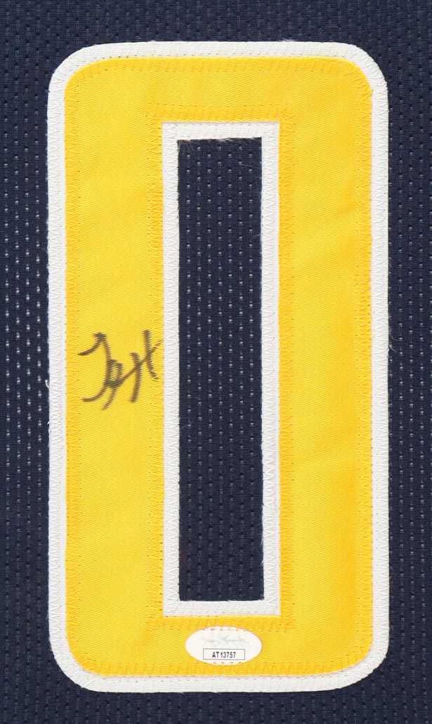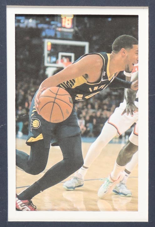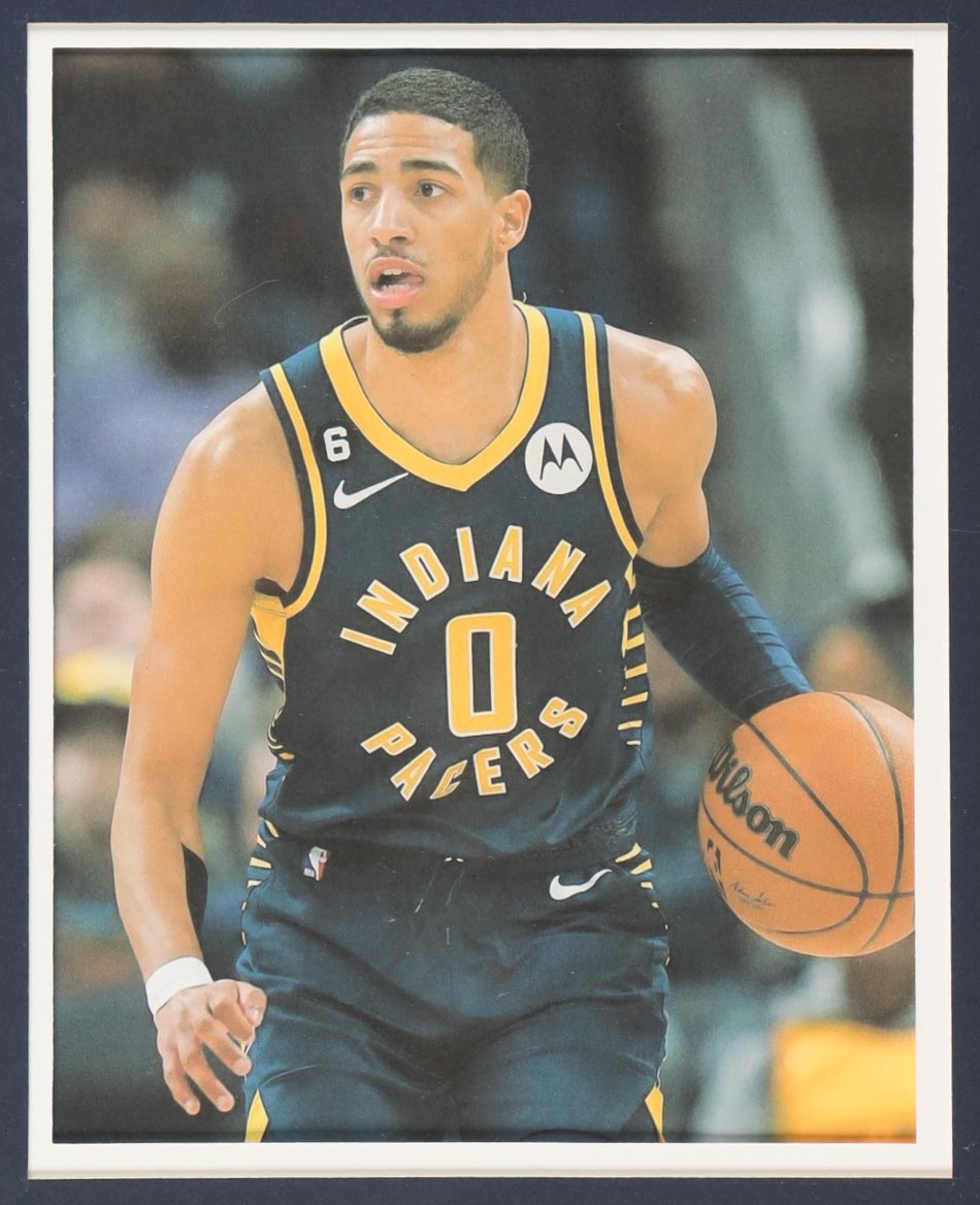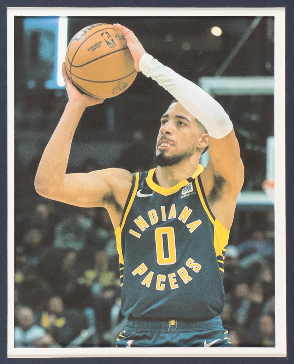 Custom frame measures approximately 34" x 42" in size and features a jersey that has been hand-signed by Tyrese Haliburton.