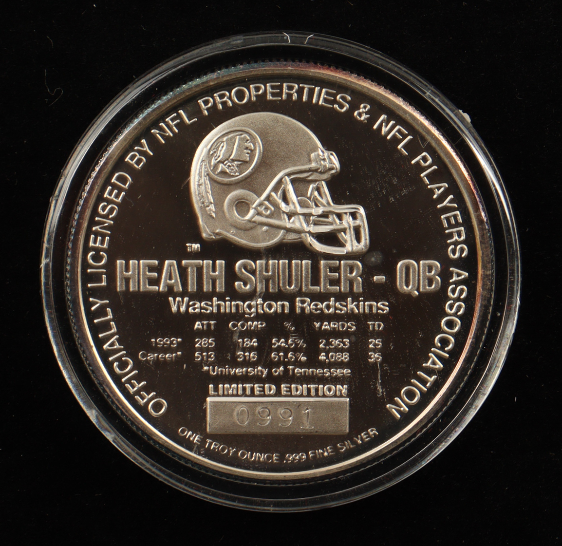 Highland Mint 1 Troy ounce .999 fine silver featuring Heath Shuler (Washington Redskins). This coin is Limited Edition and has been numbered #991/7500. Please see photos for more details on the condition of the round.