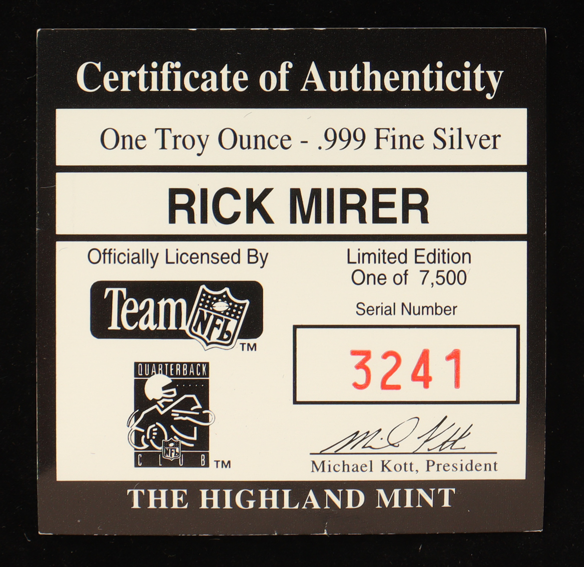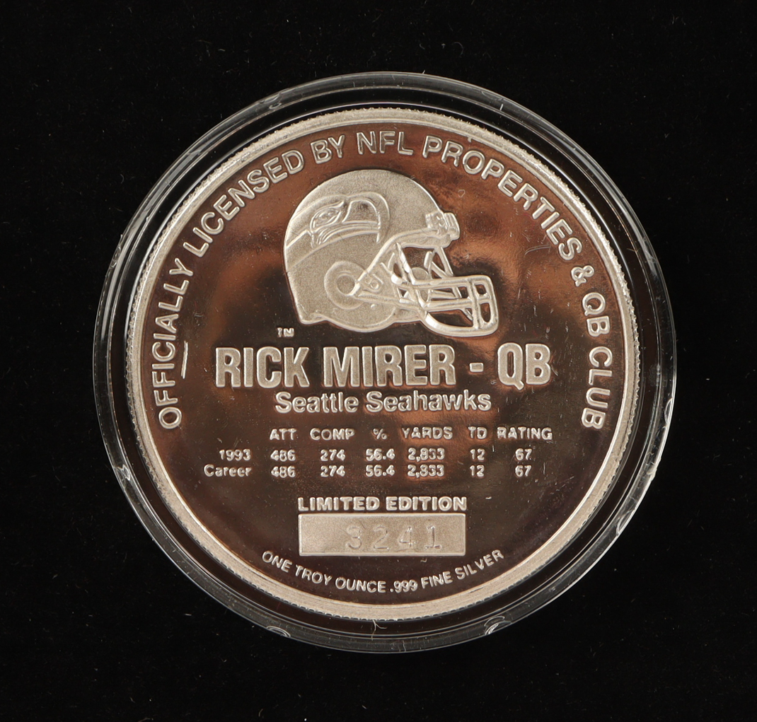 Rick Mirer LE The Highland Mint 1 Troy Oz .999 Fine Silver Commemorative Bullion Round